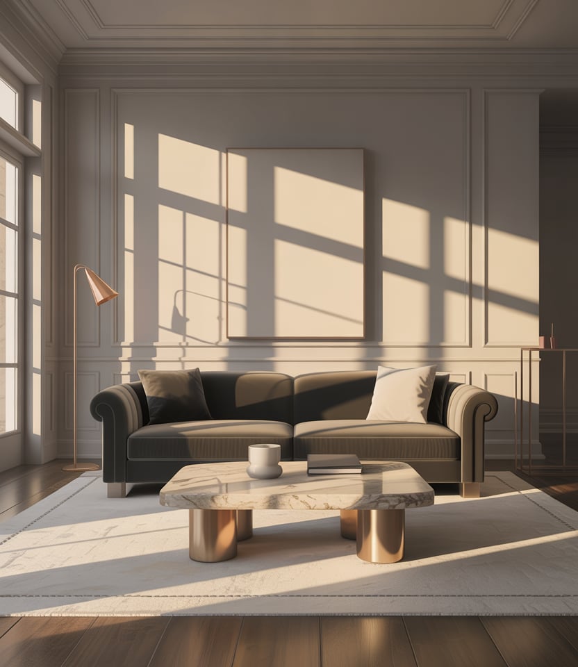 Luxury in contemporary living rooms today feels restrained rather than flashy. Using luxury and elegant design cues, this idea focuses on refined materials like stone, velvet, and brushed metal. Clean silhouettes keep the room modern, while rich textures introduce quiet drama that feels elevated but approachable.