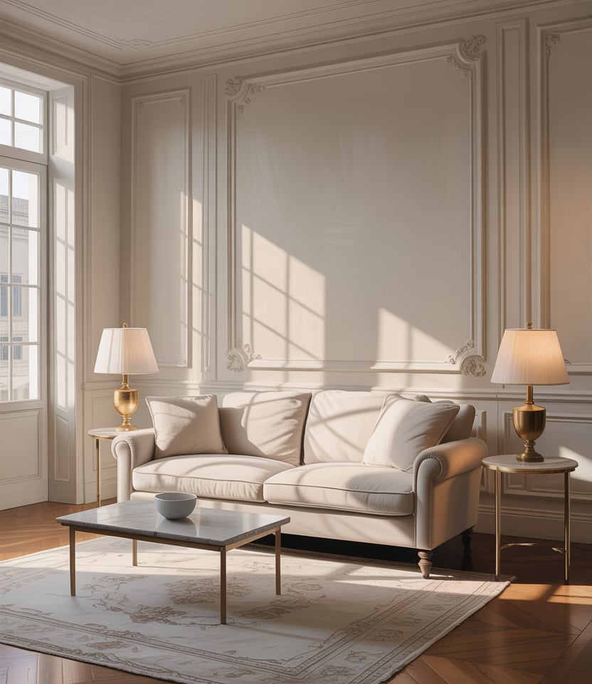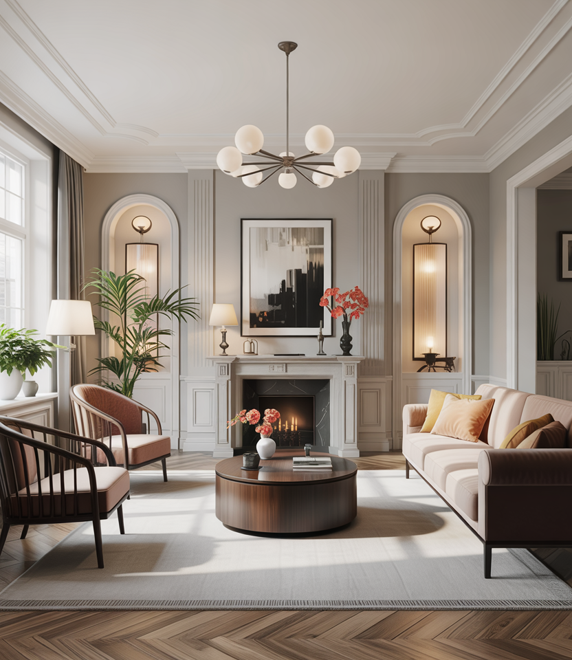 This living room idea merges contemporary structure with French and elegant influences. Subtle molding, refined lighting, and balanced proportions give the room a polished feel without excess ornamentation. Neutral colors keep the look modern, while classic detailing adds quiet sophistication that feels intentional rather than decorative.