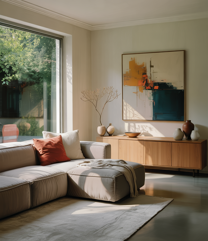 This living room embraces minimal structure while letting art drive personality. Clean walls, simple seating, and restrained materials create a calm canvas for curated artwork. The balance feels intentional rather than decorative, allowing contemporary architecture to frame personal expression without visual overload.