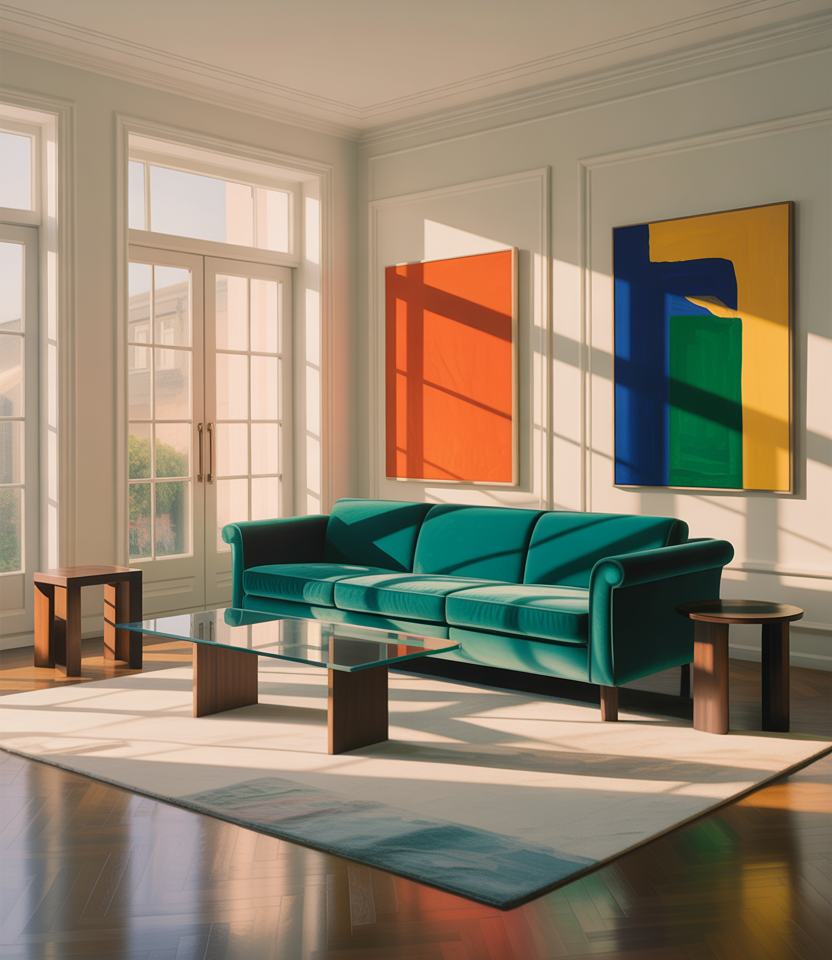 Color-forward contemporary living rooms challenge the idea that modern must be muted. Using colorful accents within a structured design’s luxury framework keeps the space vibrant yet controlled. Statement art, bold upholstery, or saturated rugs act as focal points against clean architectural backdrops.