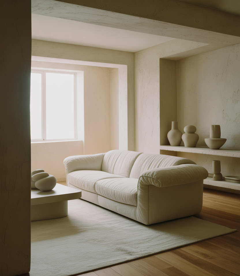 A soft neutral foundation defines this contemporary living room approach, where neutral, white, and minimal tones create a calm visual rhythm. Walls, sofas, and area rugs stay within a warm off-white spectrum, allowing texture to do the heavy lifting. Linen upholstery, subtle plaster finishes, and pale wood floors deliver quiet depth. The room feels intentional yet relaxed, making it ideal for homeowners who want timeless appeal without drifting into sterile minimalism.