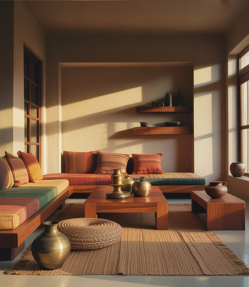 This contemporary living room draws inspiration from Indian interiors while staying firmly modern. Warm wood, low seating, and layered textiles add depth without visual heaviness. Subtle patterns, earthy tones, and sculptural décor bring cultural richness into a clean-lined space. The balance feels intentional, offering character without overwhelming the contemporary framework.