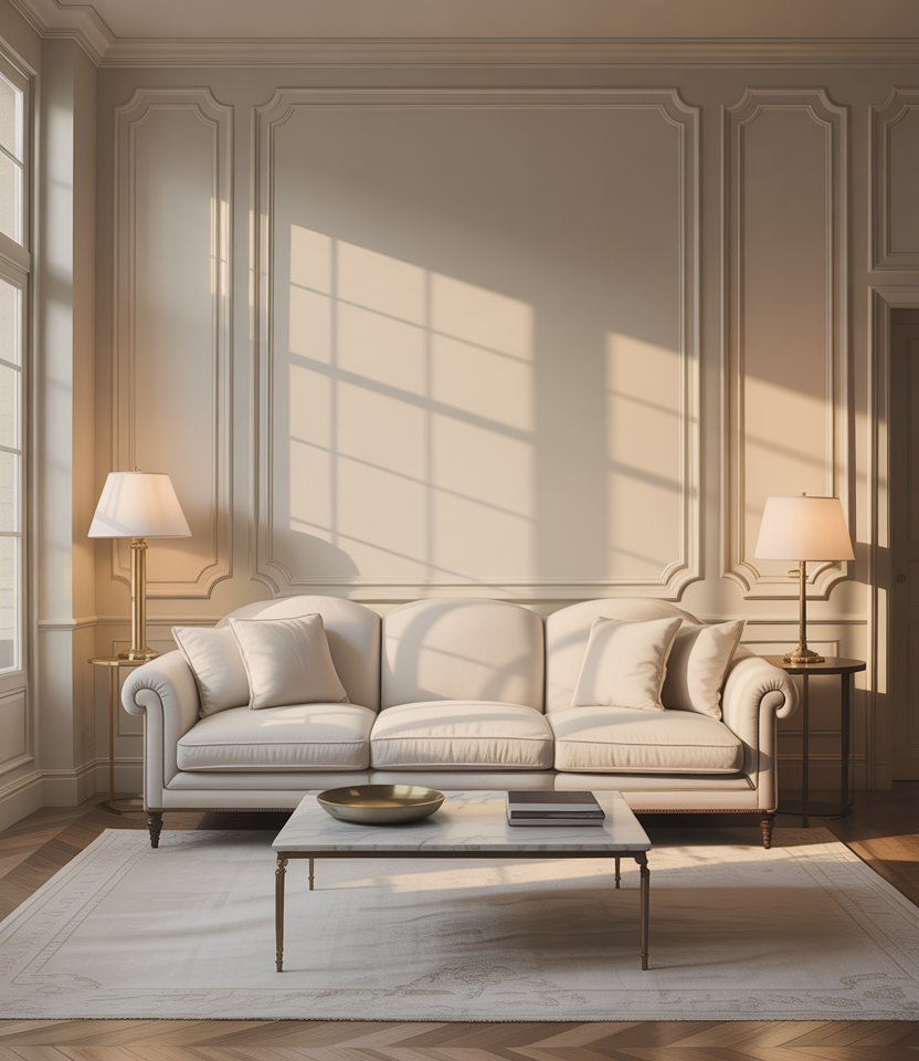 This living room idea merges contemporary structure with French and elegant influences. Subtle molding, refined lighting, and balanced proportions give the room a polished feel without excess ornamentation. Neutral colors keep the look modern, while classic detailing adds quiet sophistication that feels intentional rather than decorative.