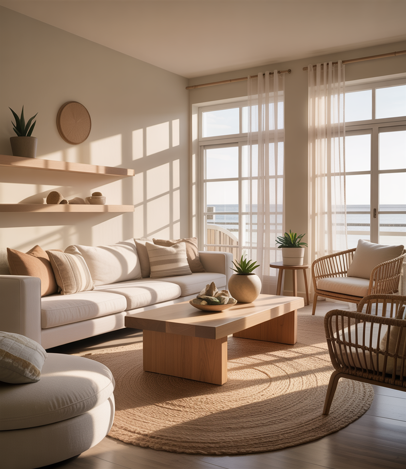 Coastal contemporary spaces reinterpret coastal and cozy aesthetics through a modern lens. Light woods, relaxed seating, and soft textiles create an airy feel without nautical clichés. The room feels fresh and casual, suited to everyday living while still visually polished.