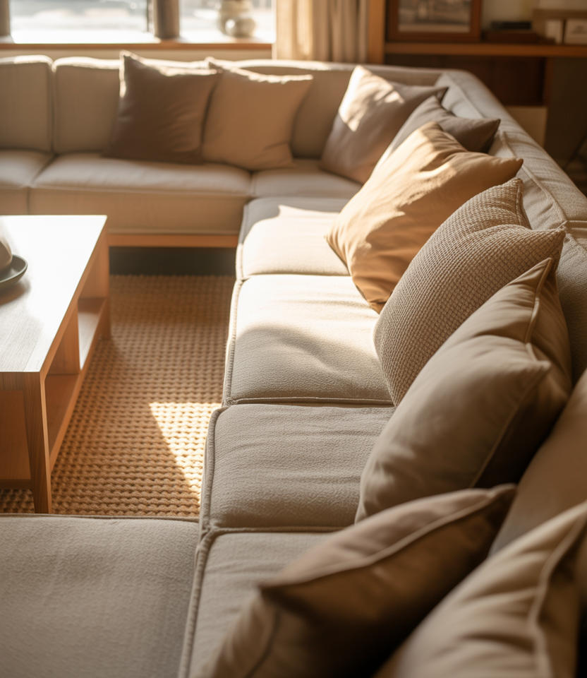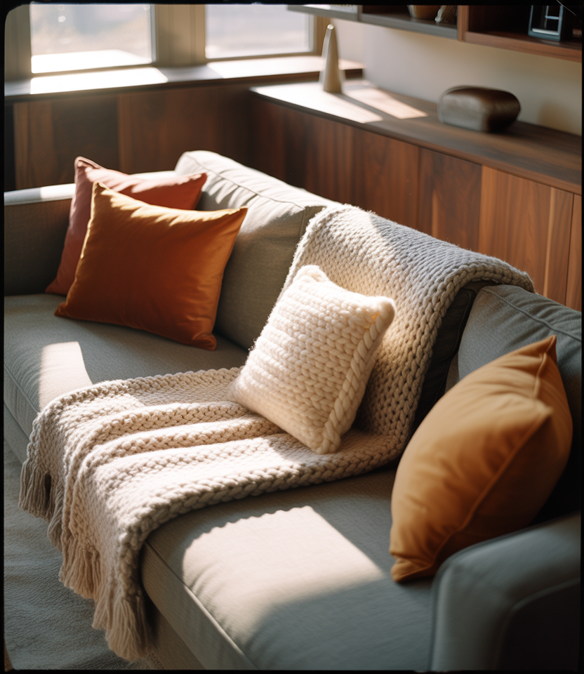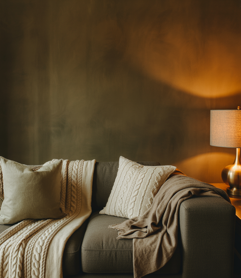 Even without a fireplace, living rooms can feel just as warm. Candles, layered lighting, and textured rugs create that same emotional comfort in apartments where fireplaces aren’t an option.