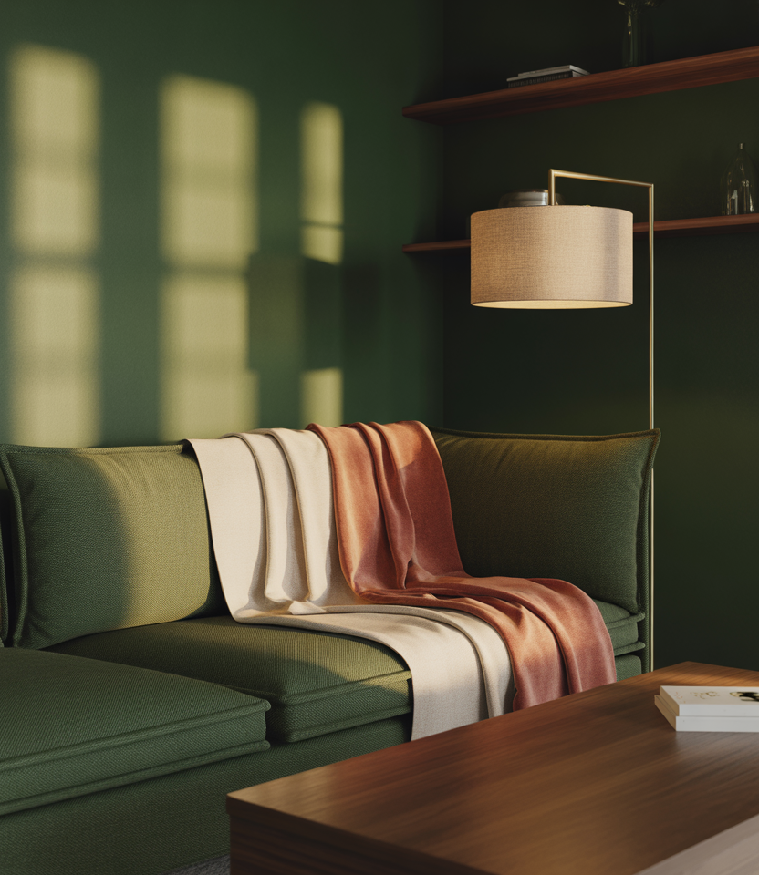 Dark doesn’t mean cold in 2026. Cozy living rooms are leaning into moody, dark, and warm colors to create intimate spaces that feel cocoon-like. Deep olive, inky blue, and chocolate brown walls make even modest rooms feel intentional and emotionally grounded rather than heavy.