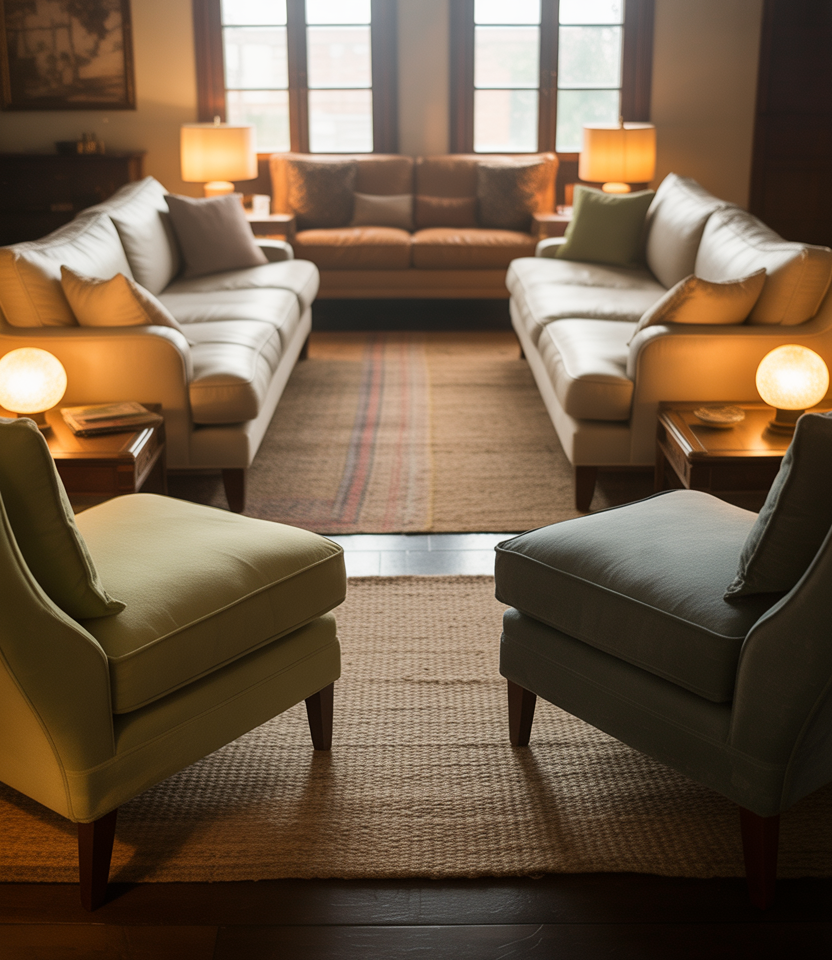 Rather than centering everything on a screen, cozy living rooms are being arranged for connection. Using comfy seating and thoughtful spacing, these rooms invite conversation and lingering. Sofas face each other, chairs float inward, and layouts feel intentionally social.