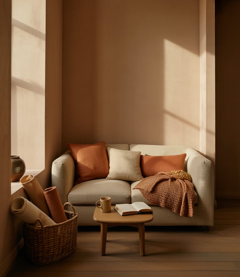 Small spaces benefit most from intentional color. In 2026, cozy living rooms use warm colors and small-space design strategies to visually wrap the room in comfort. Soft terracotta, muted caramel, and warm cream tones create cohesion rather than crowding.
