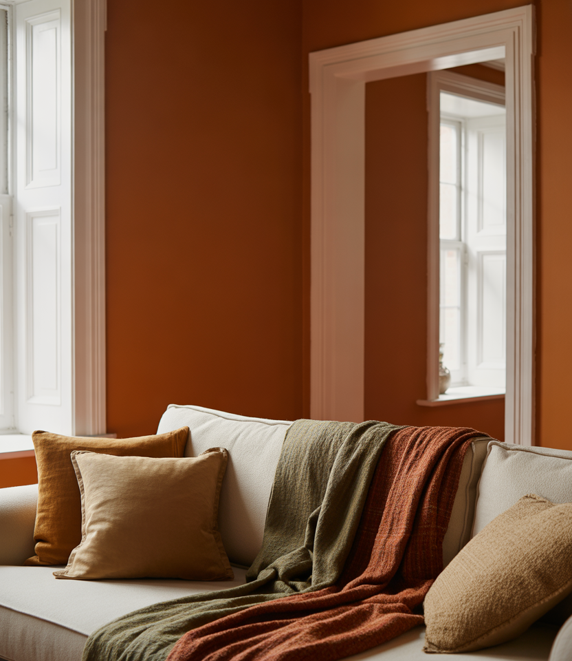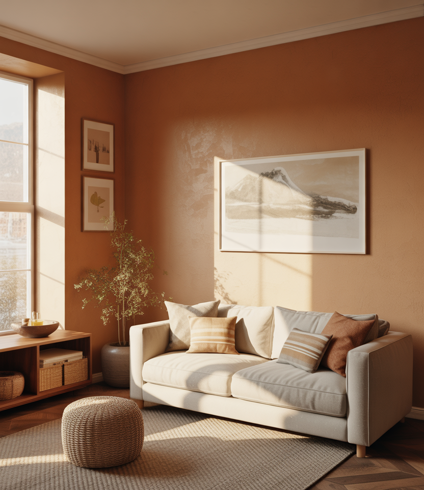 Small spaces benefit most from intentional color. In 2026, cozy living rooms use warm colors and small-space design strategies to visually wrap the room in comfort. Soft terracotta, muted caramel, and warm cream tones create cohesion rather than crowding.