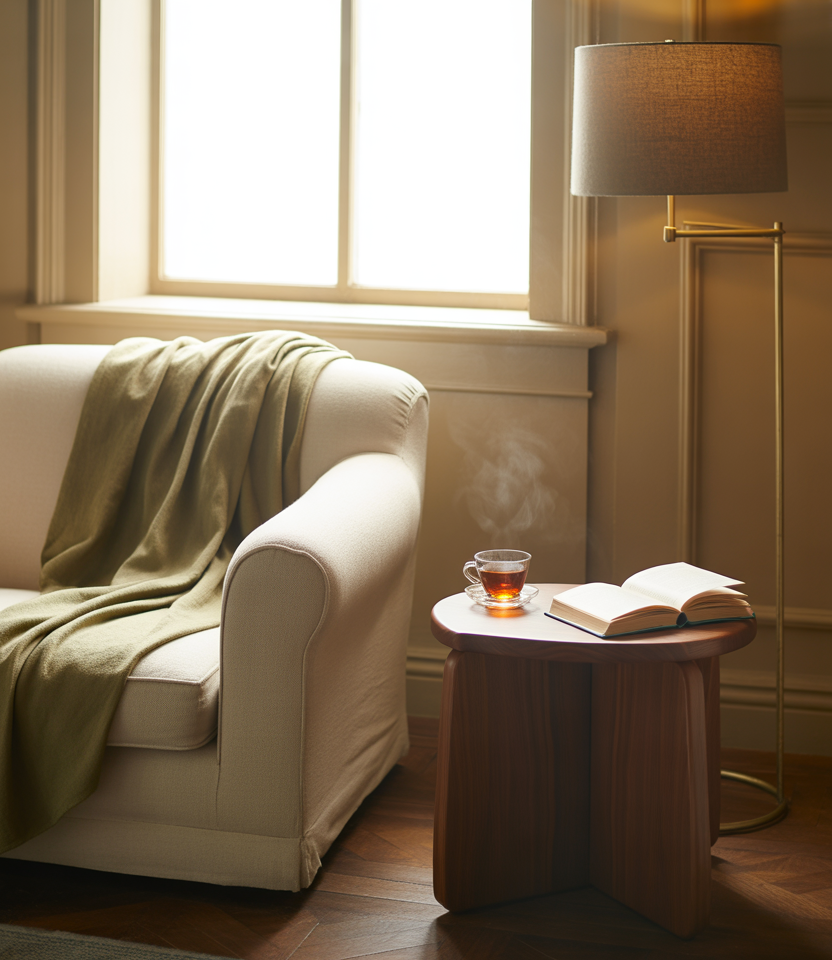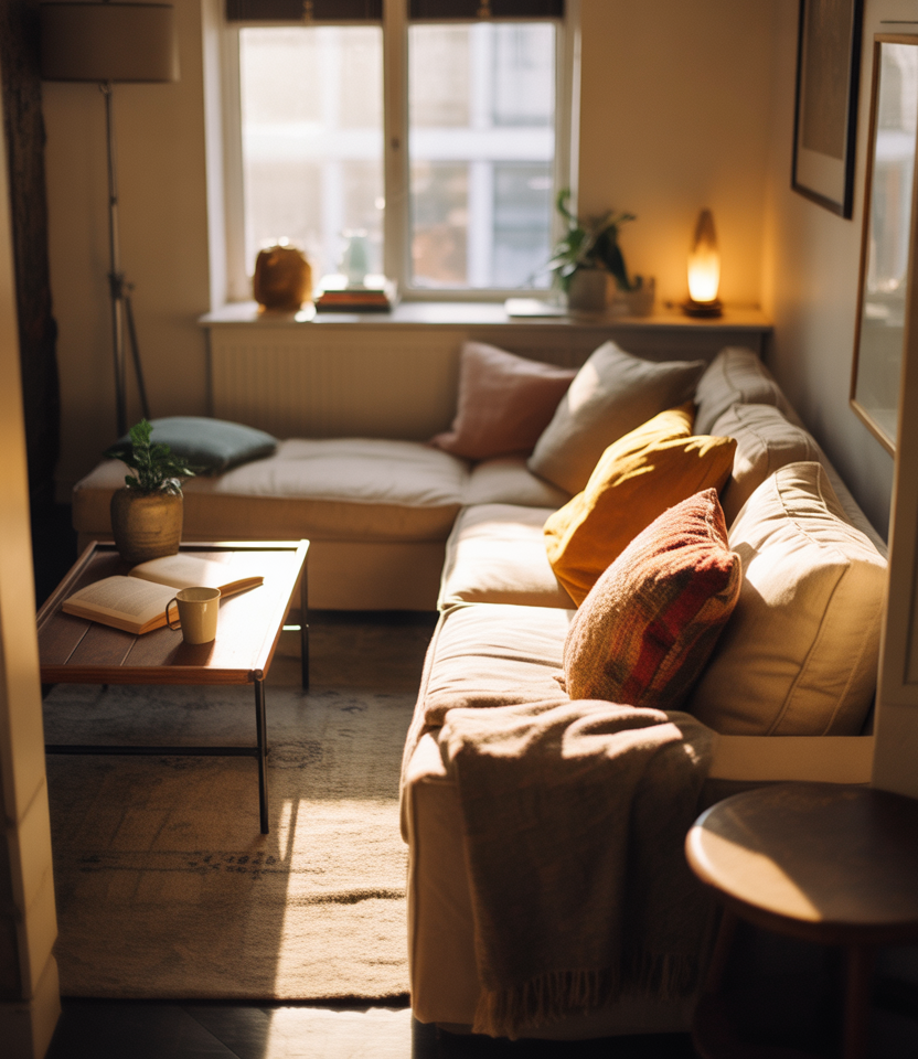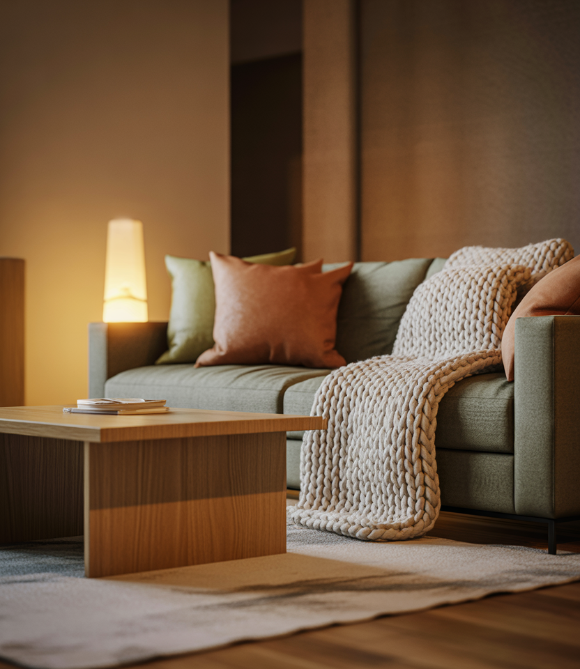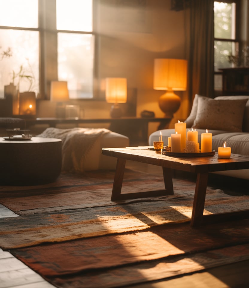 Even without a fireplace, living rooms can feel just as warm. Candles, layered lighting, and textured rugs create that same emotional comfort in apartments where fireplaces aren’t an option.