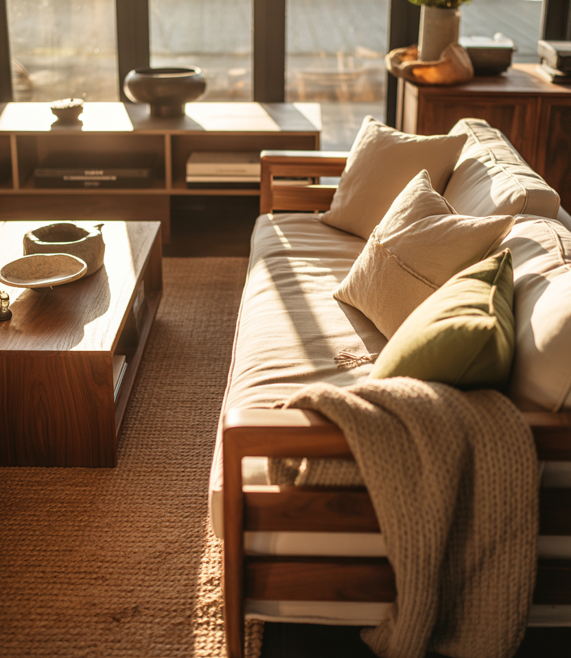 Warm wood finishes are reclaiming cozy living rooms in 2026. From oak coffee tables to walnut shelving, warm interior design and earthy materials bring visual warmth that synthetic finishes can’t replicate.