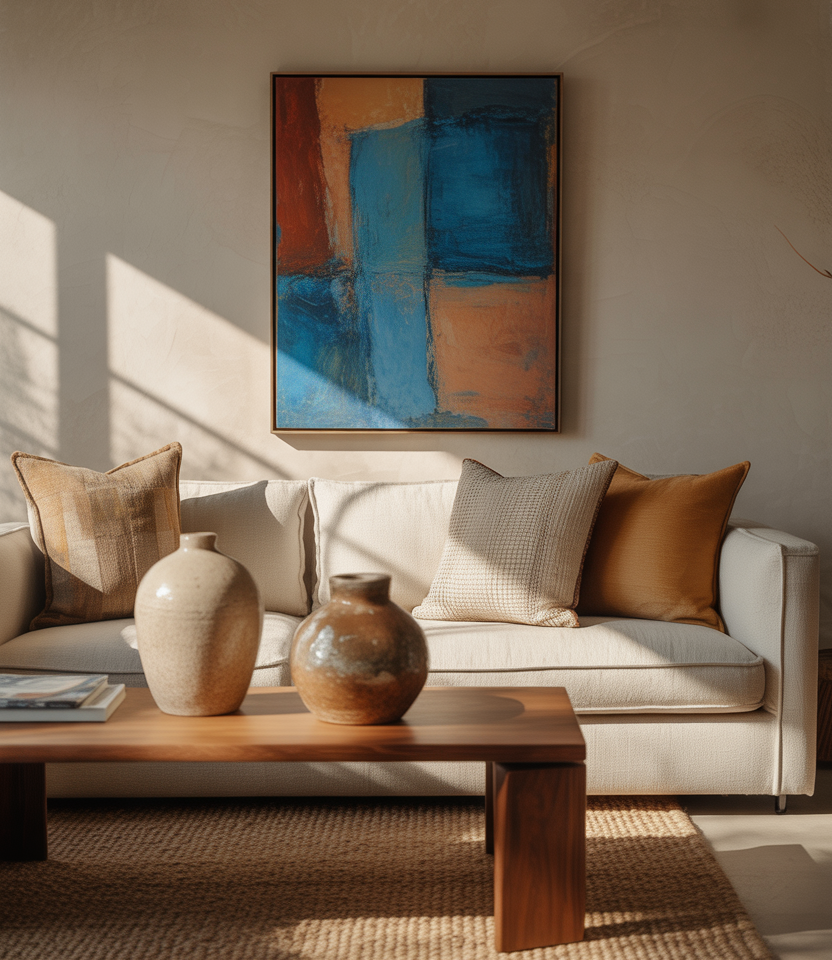Instead of bold walls, cozy living rooms in 2026 use colorful accents through art, ceramics, and books. This approach keeps the base flexible while allowing personality to shine through.