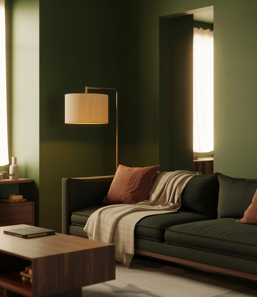 Dark doesn’t mean cold in 2026. Cozy living rooms are leaning into moody, dark, and warm colors to create intimate spaces that feel cocoon-like. Deep olive, inky blue, and chocolate brown walls make even modest rooms feel intentional and emotionally grounded rather than heavy.