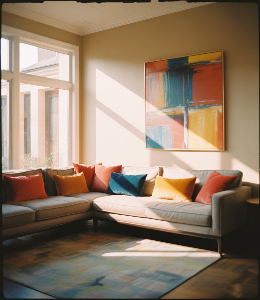 2026 sees the return of color in cozy living rooms, but in a hybrid way. Soft splashes of colorful accents layered over a neutral base bring energy without chaos. Think art, pillows, or a single painted wall rather than full saturation.