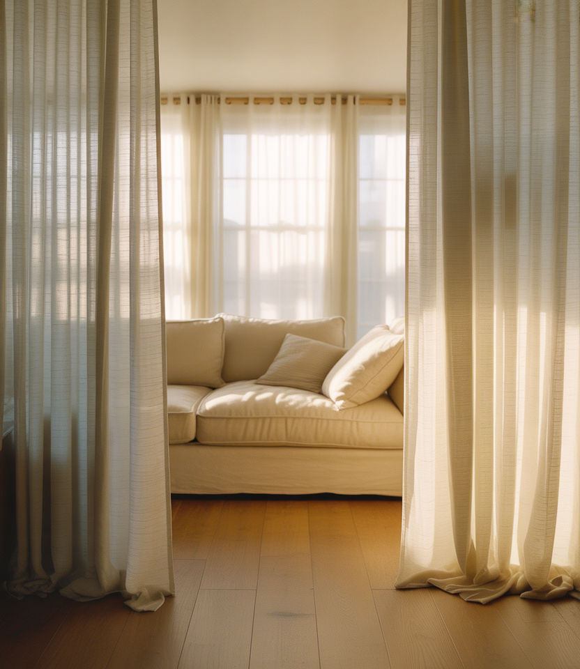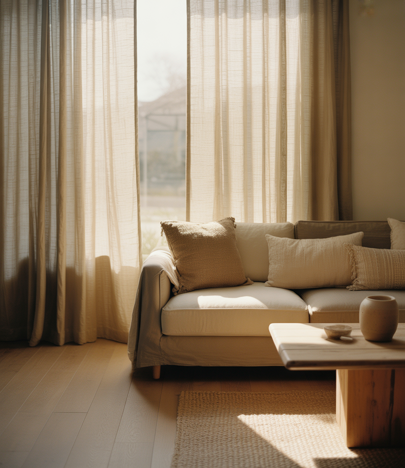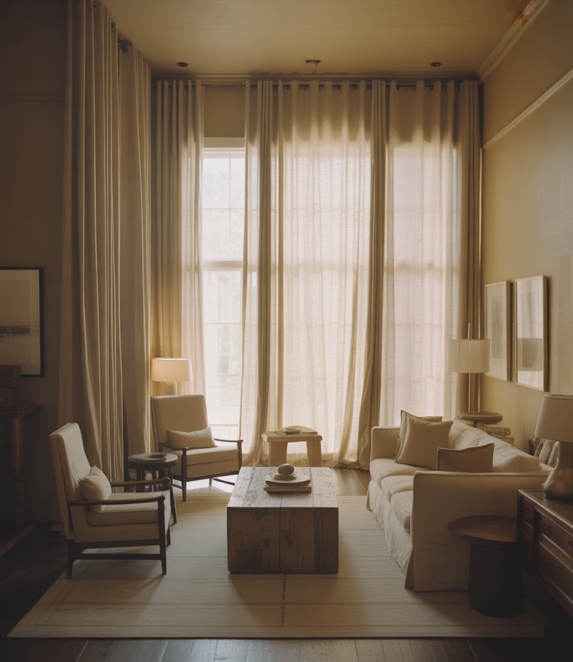 Linen curtains feel especially relevant for living room curtains in 2026, bringing a relaxed elegance that works in both modern and traditional homes. Softly textured linen in white or beige creates a breathable backdrop that filters daylight without blocking it. Long panels that kiss the floor visually stretch the room, making even modest living rooms feel more open and composed while keeping the look effortlessly natural.