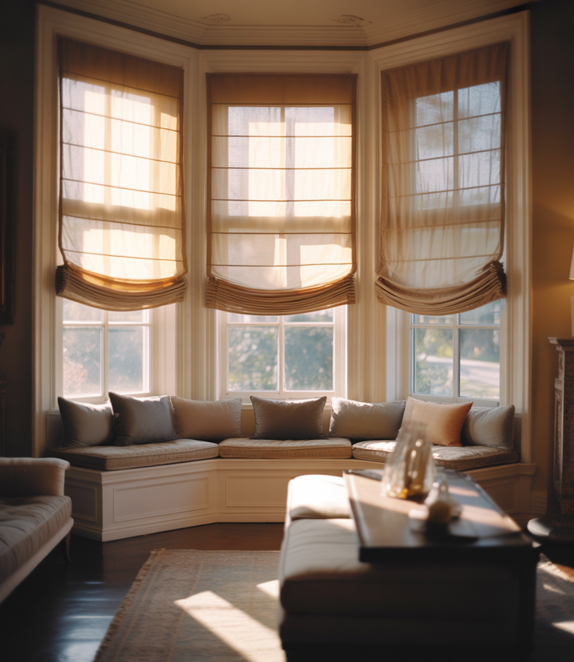Bay windows benefit from tailored solutions in living room curtains in 2026, and Roman shades offer just that. Designed specifically for a bay window, they provide clean lines while respecting the window’s geometry. Neutral fabrics keep the focus on light and structure.