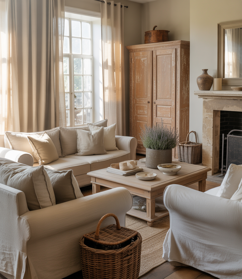 Blending soft rustic charm with brown linens will define this curtain idea for the 2026 living room. French country style will create an effortless, lived-in feel. Vintage furniture with light neutrals and subtle texturing and natural finishes will harmonize beautifully.