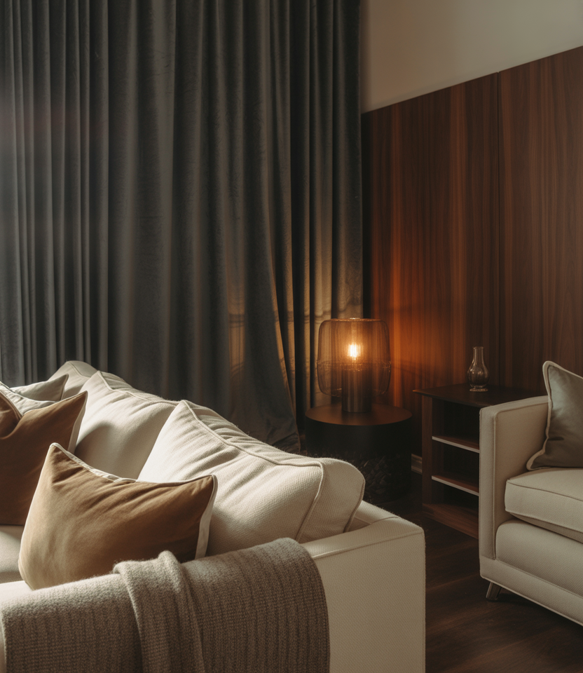For homeowners craving depth and warmth, velvet feels right at home in living room curtains in 2026. Rich velvet in brown or deep grey instantly elevates a living room, especially in spaces used heavily at night. These heavier fabrics absorb sound and light, creating a cocooned feeling that contrasts beautifully with sleek furniture or modern lighting.