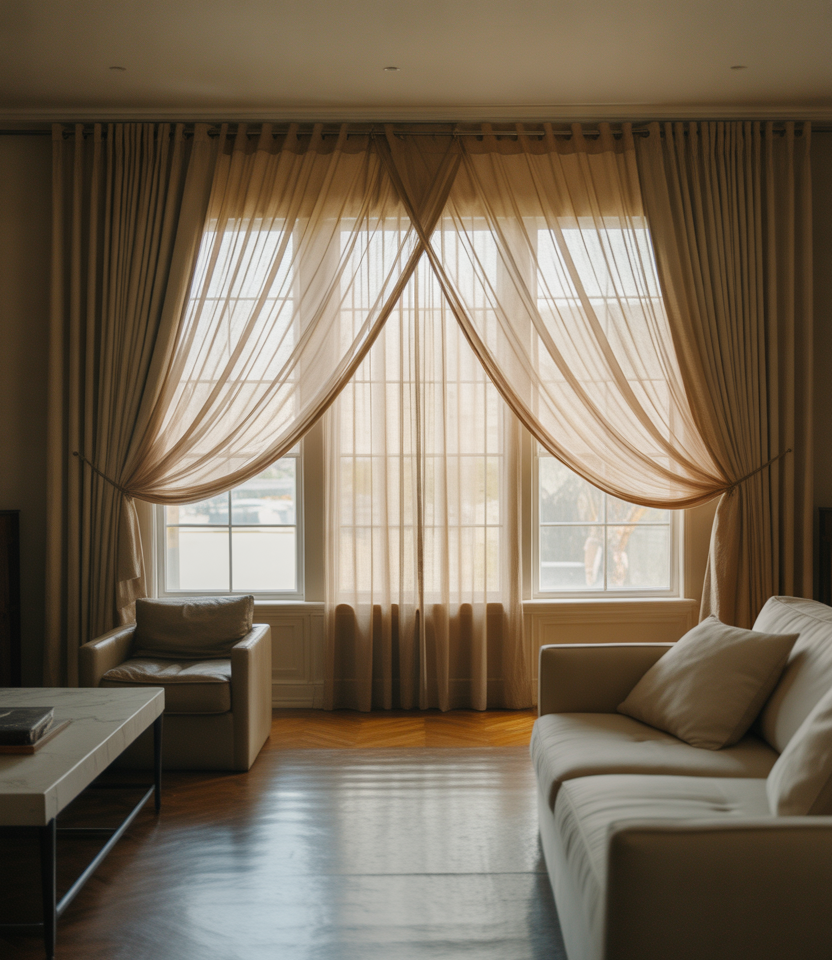 Tall windows call for equally confident treatments in curtains in living room 2026. Extra tall curtains emphasize scale, especially in rooms with high ceiling layouts. Hanging panels from ceiling height adds drama while visually anchoring large walls.