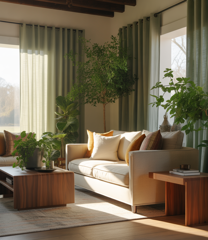 In 2026, olive and soft sage green curtains, echoing trends seen in previous years, remain the most popular choice with nature-inspired fabric selections for living rooms. Long panels made of green curtains create visual calm and, when used with wooden materials and neutral upholstery, are a great choice to ground a living space.