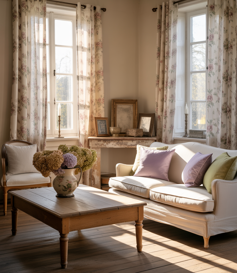 Floral patterns return gently in living room curtains in 2026, particularly within French country-inspired interiors. Subtle floral prints in faded tones add personality without overpowering the room. Paired with light walls and classic furniture, these curtains bring warmth and a lived-in feeling that feels collected over time.