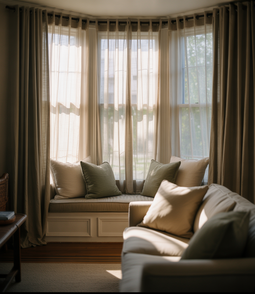 Bay windows deserve special attention in living room curtains in 2026. Tailored panels designed for a bay window enhance architectural depth while maintaining light flow. Using long curtains in soft neutrals keeps the focus on the window shape itself, turning it into a natural focal point.