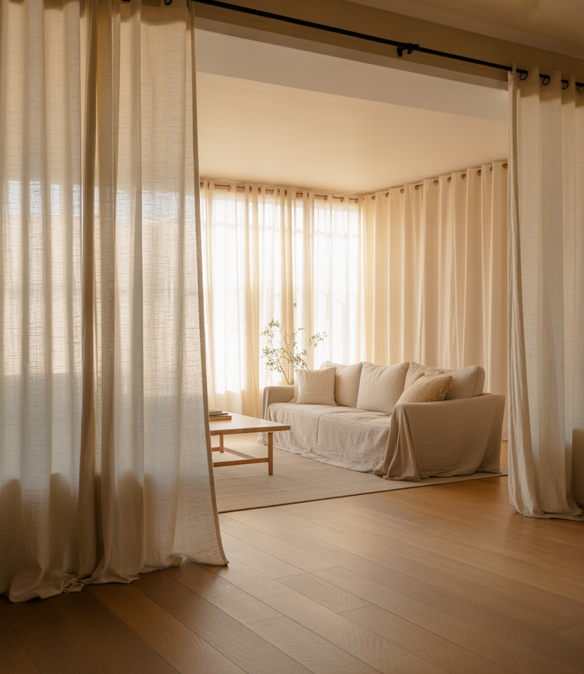 Linen curtains feel especially relevant for living room curtains in 2026, bringing a relaxed elegance that works in both modern and traditional homes. Softly textured linen in white or beige creates a breathable backdrop that filters daylight without blocking it. Long panels that kiss the floor visually stretch the room, making even modest living rooms feel more open and composed while keeping the look effortlessly natural.