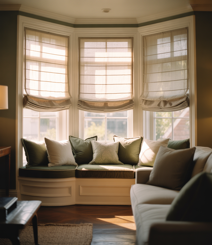Bay windows benefit from tailored solutions in living room curtains in 2026, and Roman shades offer just that. Designed specifically for a bay window, they provide clean lines while respecting the window’s geometry. Neutral fabrics keep the focus on light and structure.