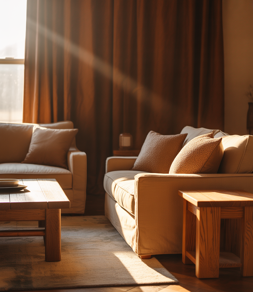 Earthy tones in curtains in the living room in 2026 will ground and provide depth and comfort with brown curtains. Cozy, stable, and welcoming atmospheres will be created, especially in family-focused homes, with paired wood floors and brown leather or fabric sofas.