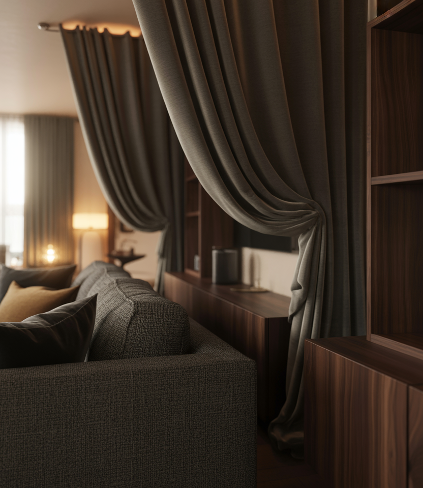 For homeowners craving depth and warmth, velvet feels right at home in living room curtains in 2026. Rich velvet in brown or deep grey instantly elevates a living room, especially in spaces used heavily at night. These heavier fabrics absorb sound and light, creating a cocooned feeling that contrasts beautifully with sleek furniture or modern lighting.