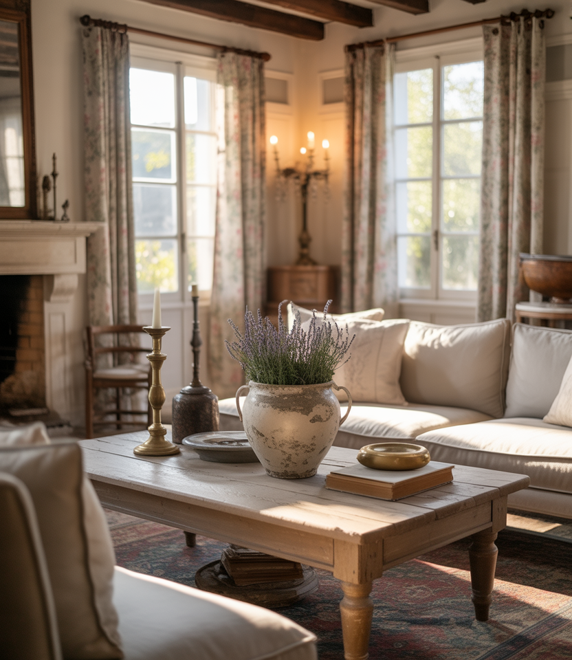 Floral patterns return gently in living room curtains in 2026, particularly within French country-inspired interiors. Subtle floral prints in faded tones add personality without overpowering the room. Paired with light walls and classic furniture, these curtains bring warmth and a lived-in feeling that feels collected over time.