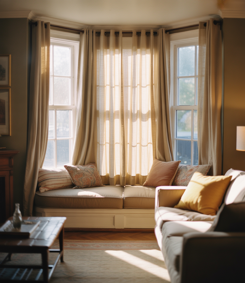 Bay windows deserve special attention in living room curtains in 2026. Tailored panels designed for a bay window enhance architectural depth while maintaining light flow. Using long curtains in soft neutrals keeps the focus on the window shape itself, turning it into a natural focal point.