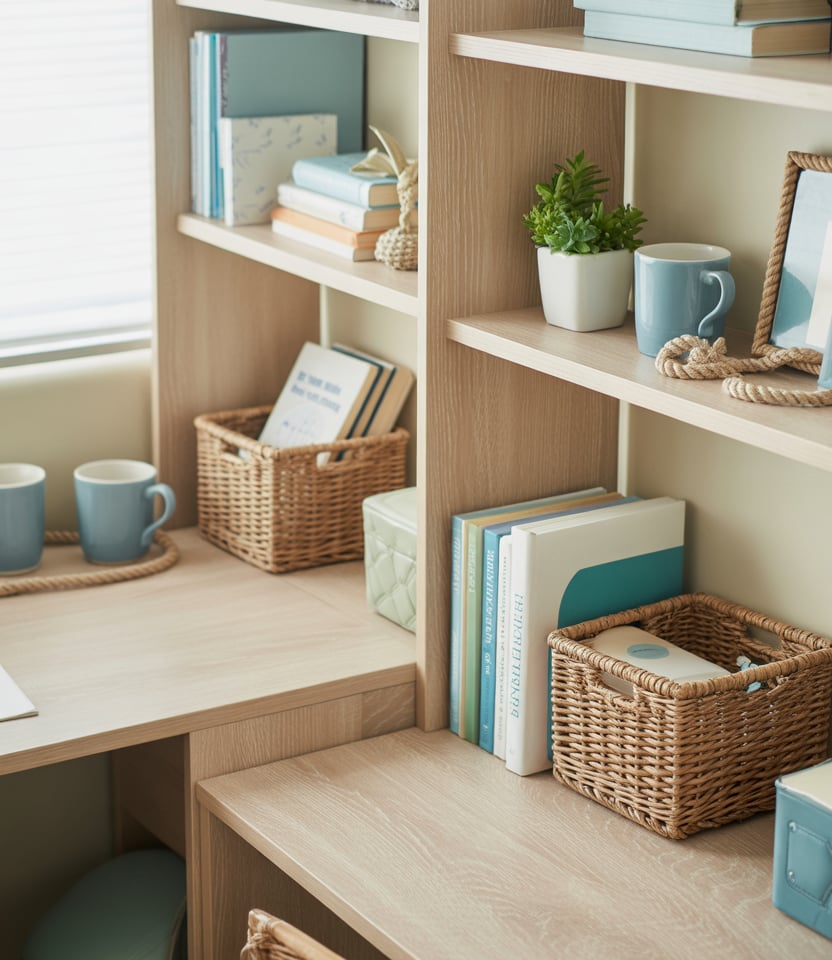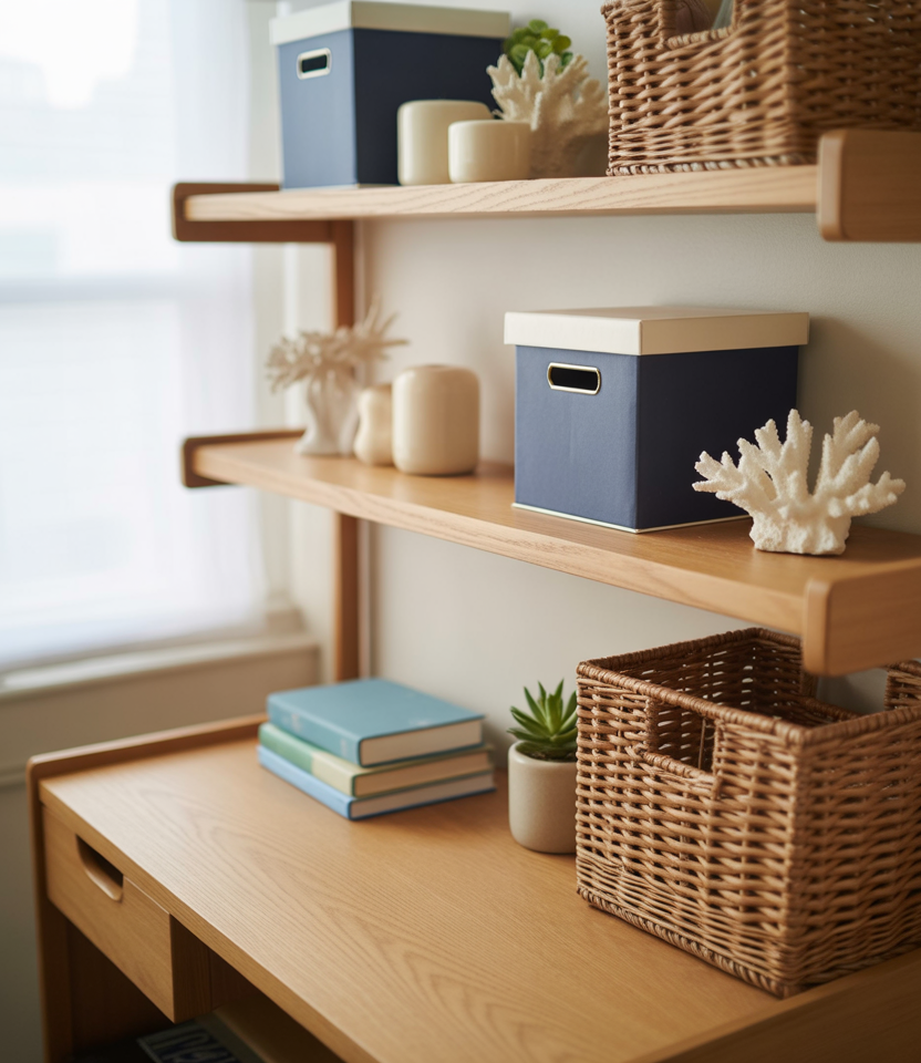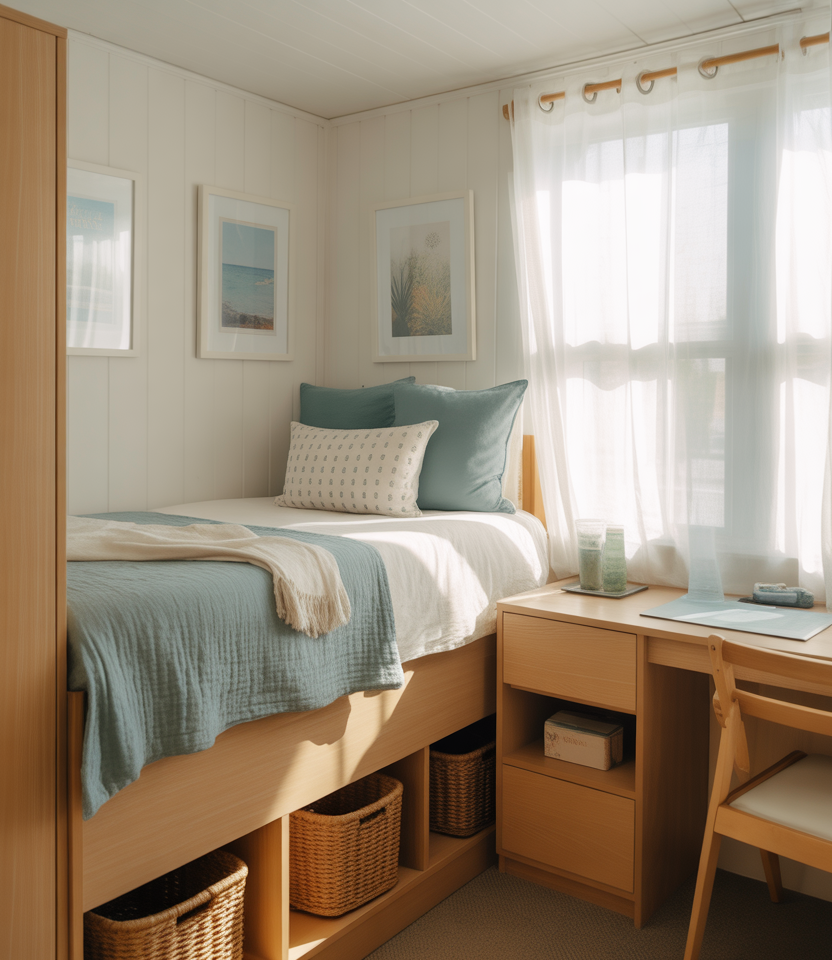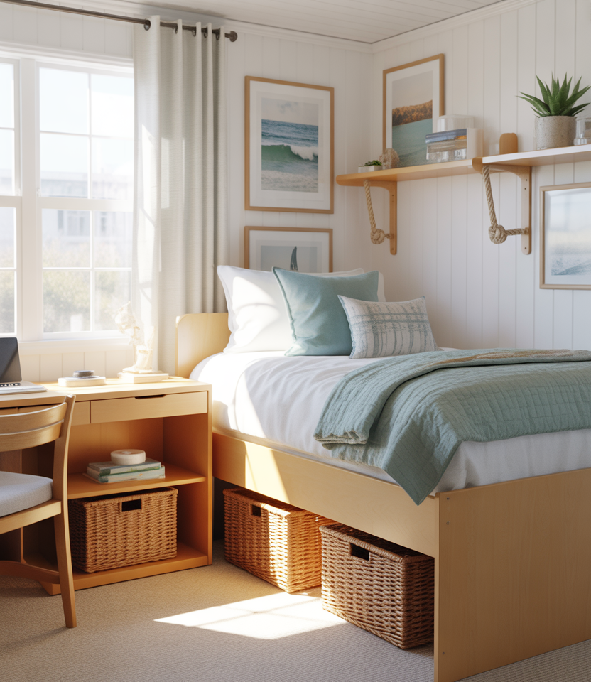 Many students borrow subtle coastal details—like driftwood tones, woven baskets, or pale blue accessories—to elevate their desk shelves. These elements lighten the visual load of textbooks and tech gear, offering a refreshing breeze of style in small quarters. It’s a smart way to feel grounded during busy university semesters.