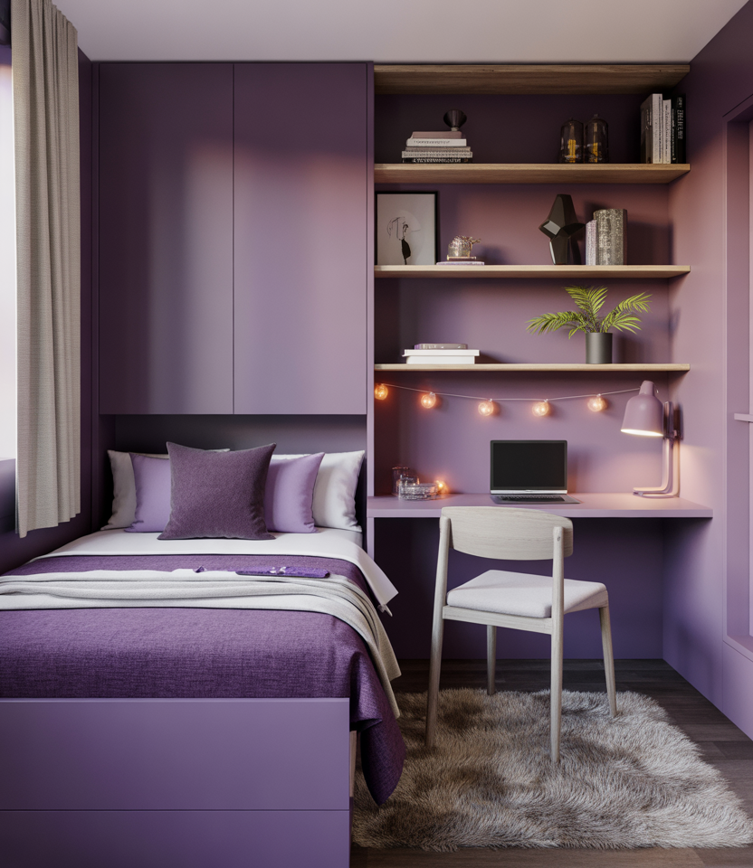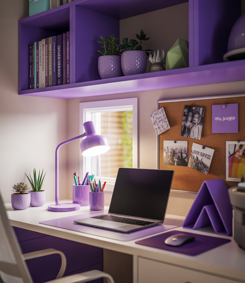 Shades of purple can energize your creative corner, making even small desk areas feel expressive. Students who crave playful inspiration often incorporate lavender organizers, violet pencil cups, or plum-toned tech accessories. This palette subtly boosts mood without overwhelming other décor elements.