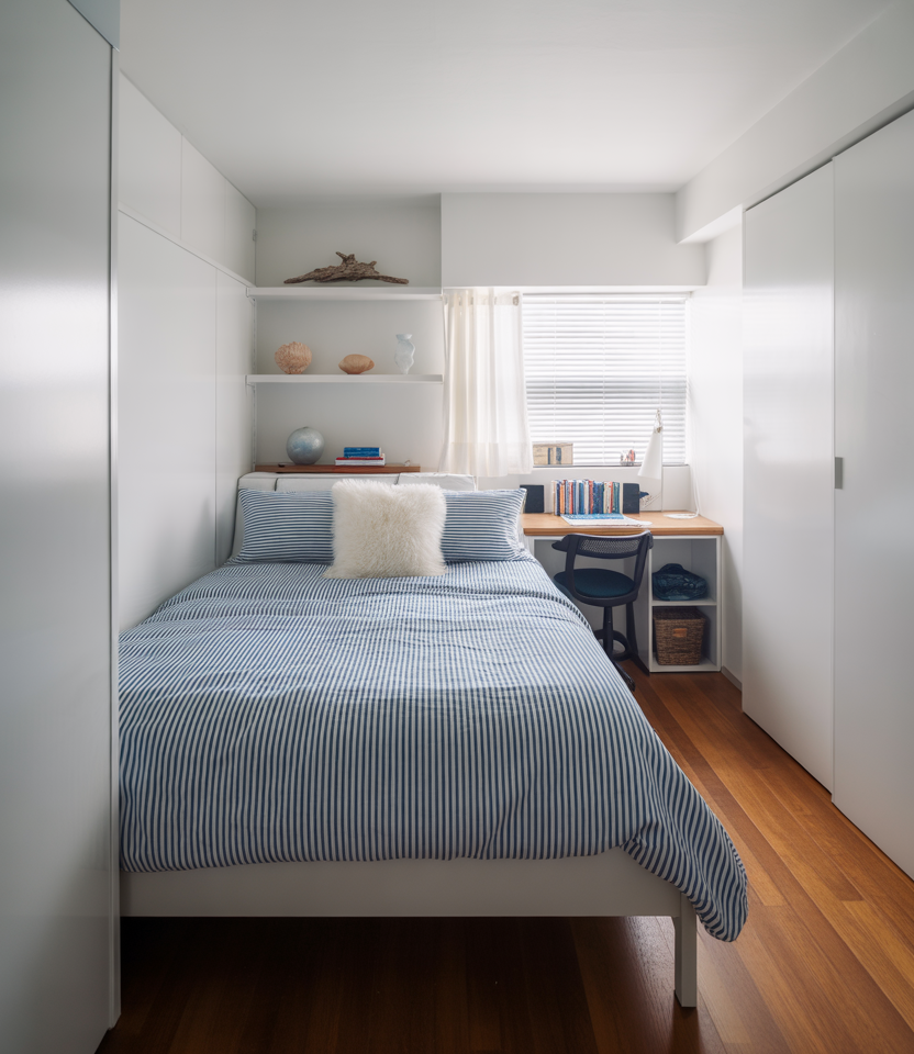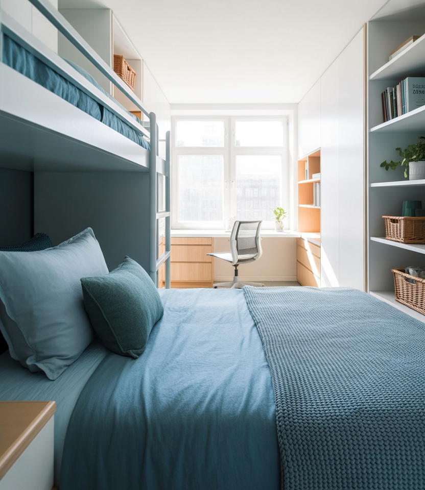 Clean-lined bunk setups create order in tight dorms, especially when accented with blue textiles that calm the space. This style blends Scandinavian simplicity with student practicality, perfect for those wanting a clutter-free sanctuary after long college days. Adding structured bins or slim shelving keeps the look intentional while still feeling warm and youthful.