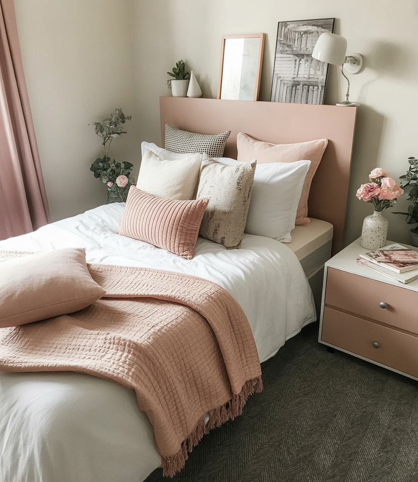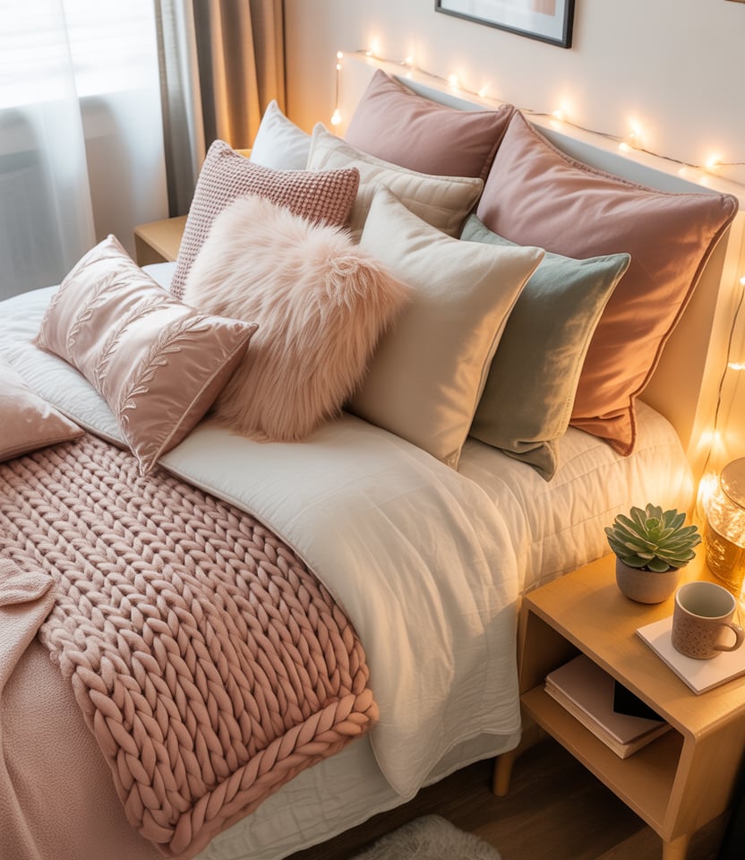 Layering blankets, throws, and pillows in thoughtful color schemes helps transform a stark dorm into something truly cozy. Students often combine muted neutrals with hints of light pink or sage to warm up the room. The trick is mixing textures—knits, velvets, cotton—to create depth without overwhelming the limited space.
