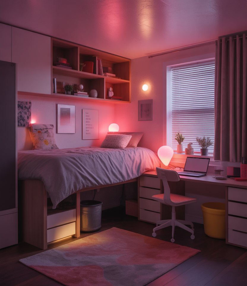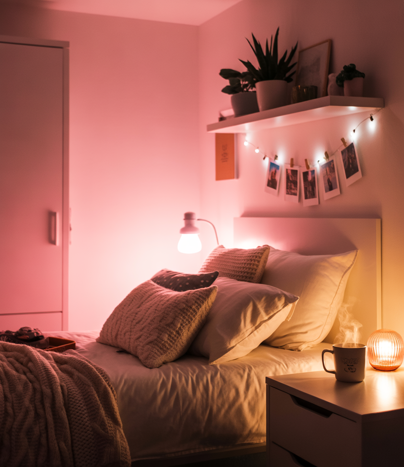 Soft pink accent lights are becoming a dorm essential for students who want ambiance without harsh overhead glare. When blended with aesthetic décor, they create a mellow nighttime zone perfect for unwinding. I’ve seen clusters of small lamps transform even the plainest wall into a warm, inviting backdrop.