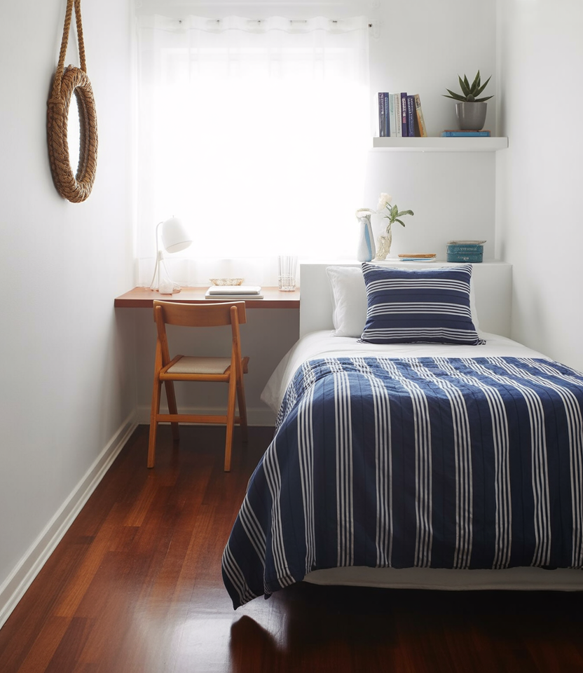 For renters looking for ideas for college apartments, crisp blue and white bedding presents an effortless upgrade that blends seamlessly with neutral walls and mixed furniture. This palette seems timeless, with just a touch of a coastal vibe that provides a clean foundation for extra accents. It’s an especially excellent fit for students who want to look polished without too much fuss.