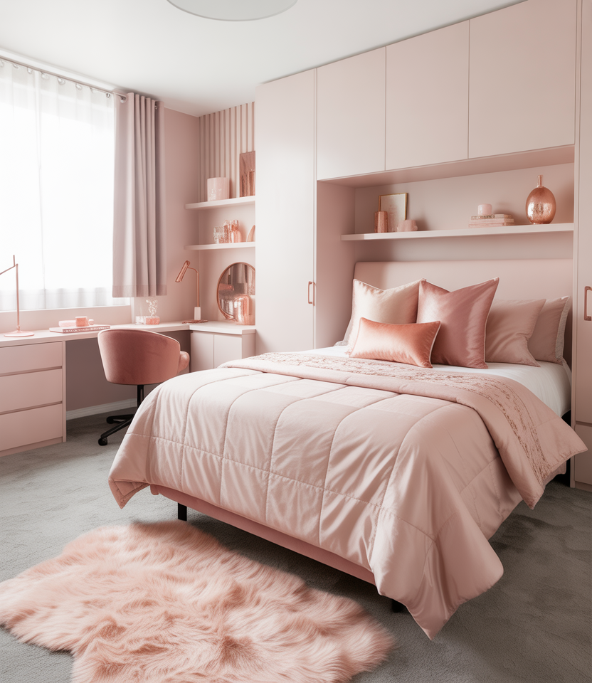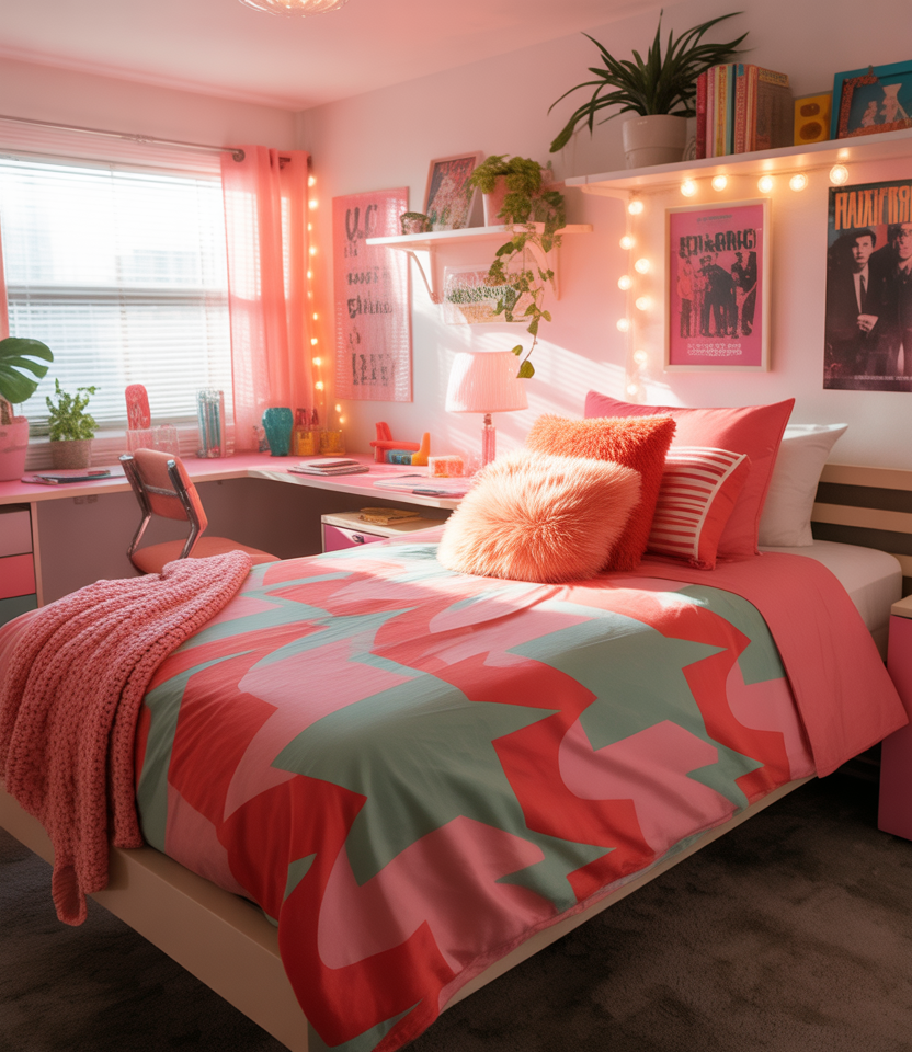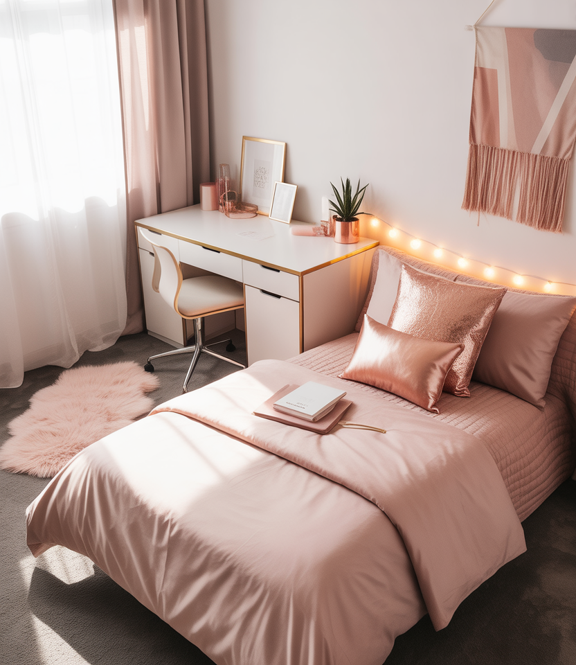 Soft pink, muted light pink, and metallic details feel fresh again—especially when you’re adding glamorous touches to a small university room. This style uses sleek lines and subtle shimmer to elevate cramped dorm layouts, proving that a touch of glam doesn’t have to overwhelm shared quarters. I once watched a roommate transform her space with peel-and-stick metallics that looked surprisingly high-end on a student budget.