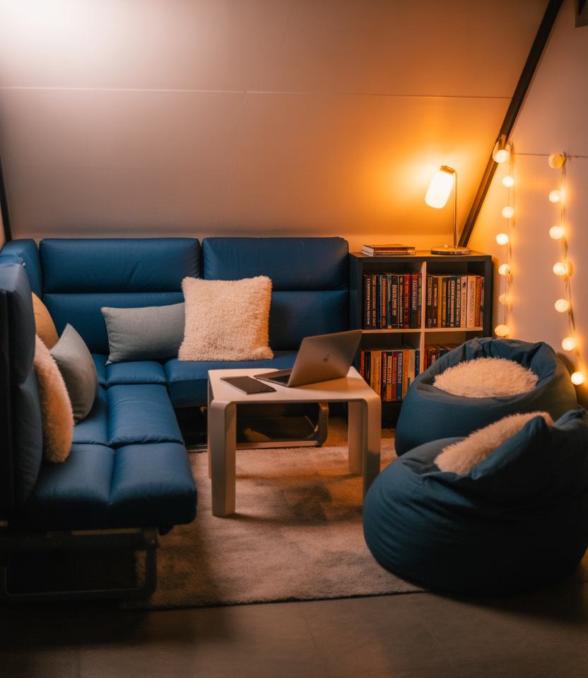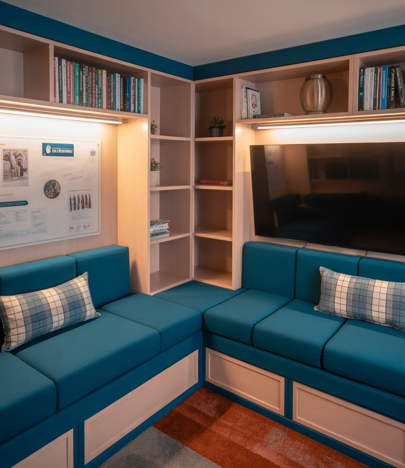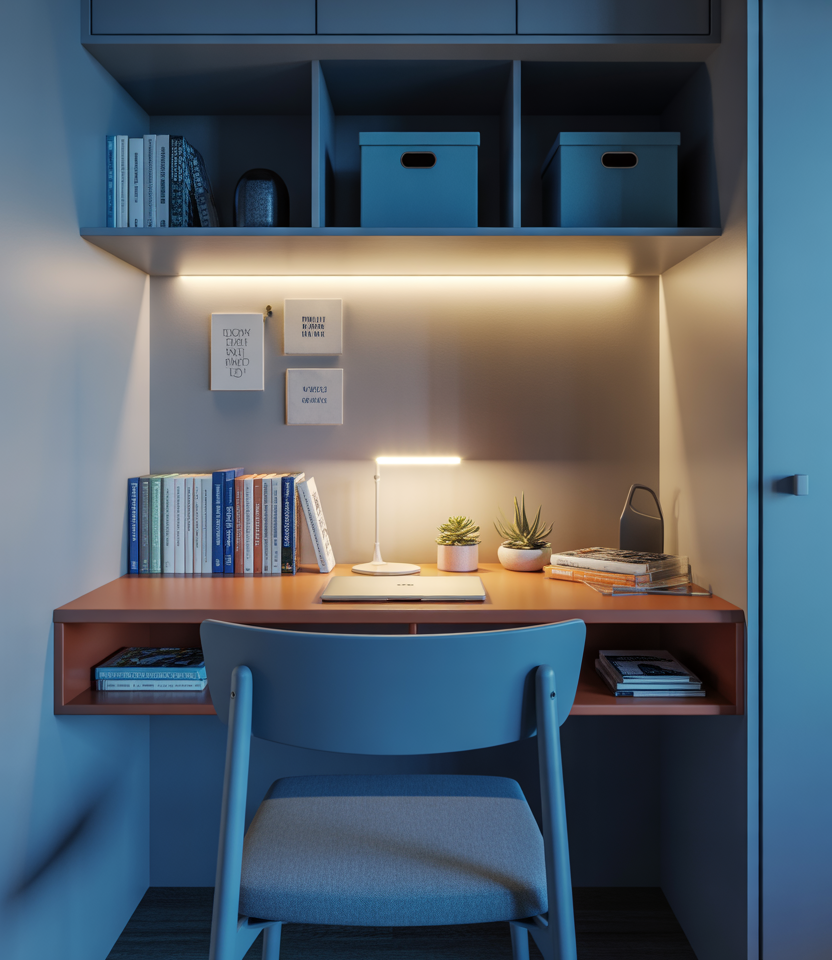 Creating a small lounge corner with cushioned stools or floor chairs in calming tones of blue helps students carve out an easy and relaxed alternative to the usual desk setup. Such a layout works especially well in college dorms, wherein long nights of studies call for more comfortable seating. Blending soft fabrics with subtle lighting keeps the area inviting and yet feels very student-friendly and adaptive.