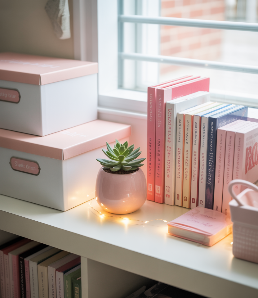 Combining pink accents with crisp white shelving creates an airy, polished aesthetic that brightens tight spaces. Students often use this style to organize books, skincare, and decorative items without feeling cluttered. It’s an easy way to keep essentials accessible while still maintaining a visually cohesive room that feels thoughtfully put together—perfect for busy university life.