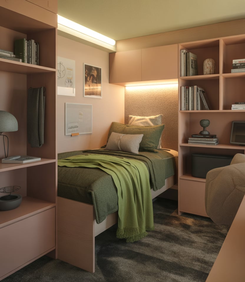 A reading nook anchored by a plush green throw or cushion set can instantly make a dorm feel more personal and cozy. Adding a slim lamp and a couple of curated décor pieces helps define the space without taking up much room. Many students use this nook as a retreat from noisy hallways, turning a single corner into a restful pocket of calm and warmth.