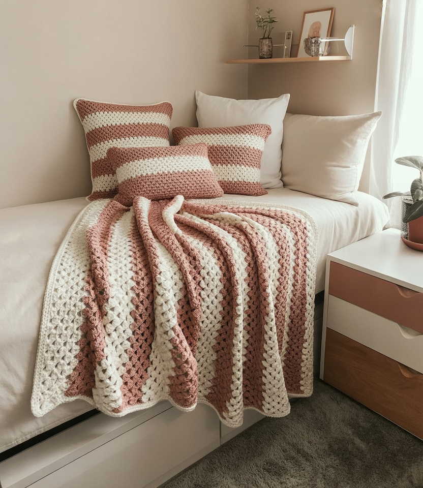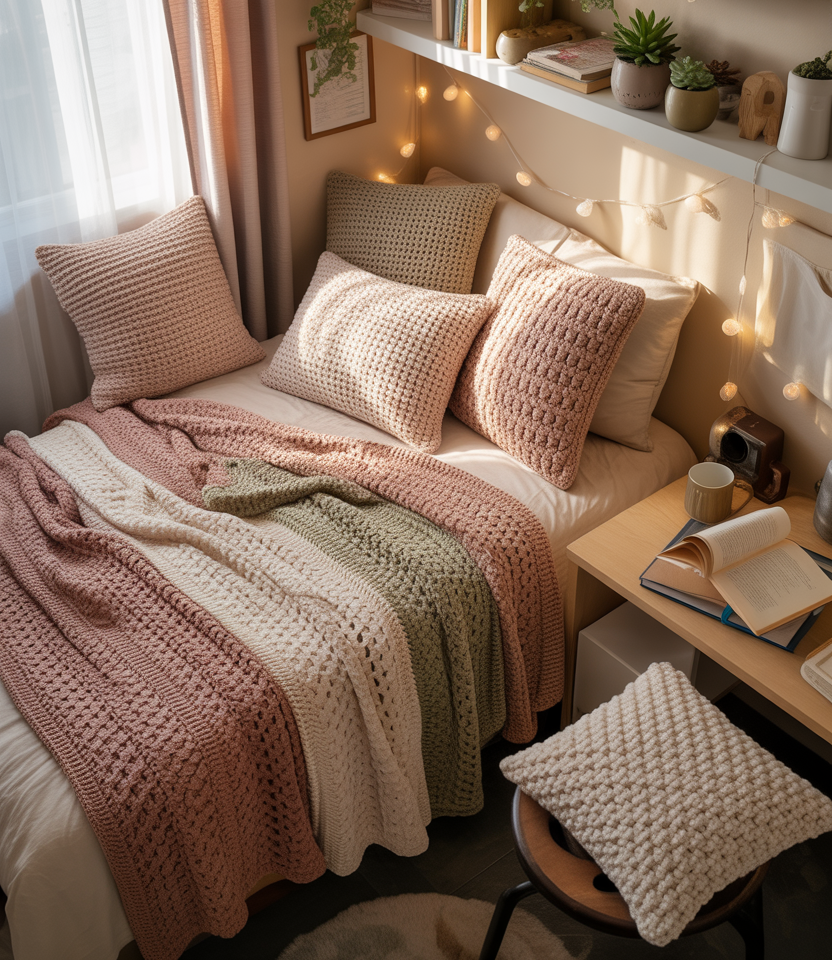 Stitched blankets and handmade accents made from crochet have become a favorite among decor enthusiasts because they add tactile comfort without visual noise. Dorm rooms benefit from these soft layers, especially in neutral or pastel color schemes that make the space feel lived-in. Friends of mine swap handmade pieces each year, giving their rooms sentimental personality and warmth.