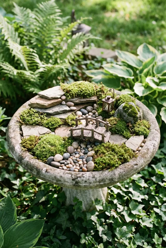 Turn a tired yard feature into the most photographed corner of your backyard. Drain the Bird bath, then layer river stones, moss, and a tiny bridge so it reads like a little “island world.” This style fits the Pinterest vibe of outdoor fairy garden ideas because it’s elevated—literally—so the details are easy to see from a patio chair.