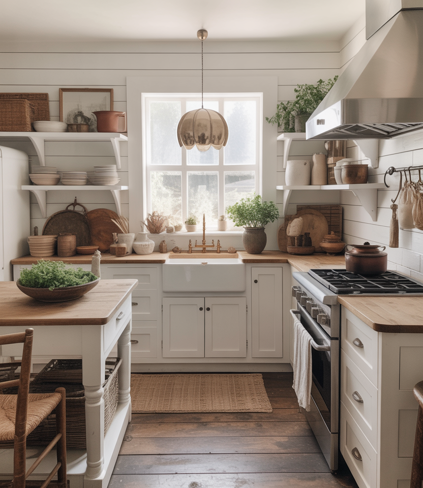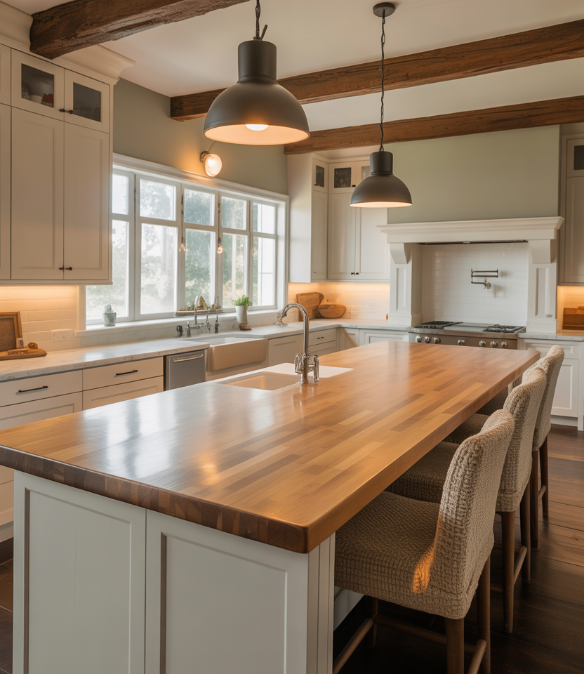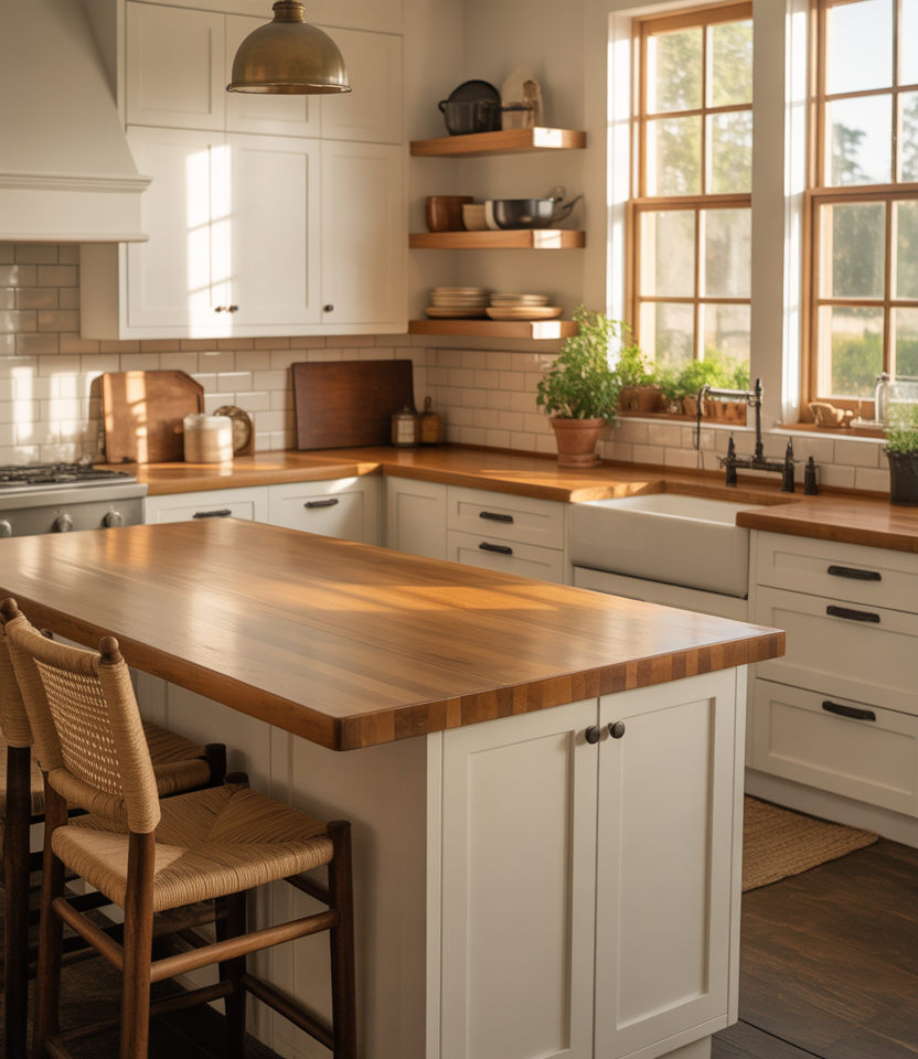 A 2026 farmhouse kitchen effortlessly blends modern, clean lines with familiar textures. Think flat-front cabinets meeting butcher block, or matte fixtures paired with antique stools. This idea works beautifully in open-concept homes where people want simplicity without sacrificing a cozy feel. Designers often note that restraint—just a few rustic touches—is what keeps the look fresh rather than themed.