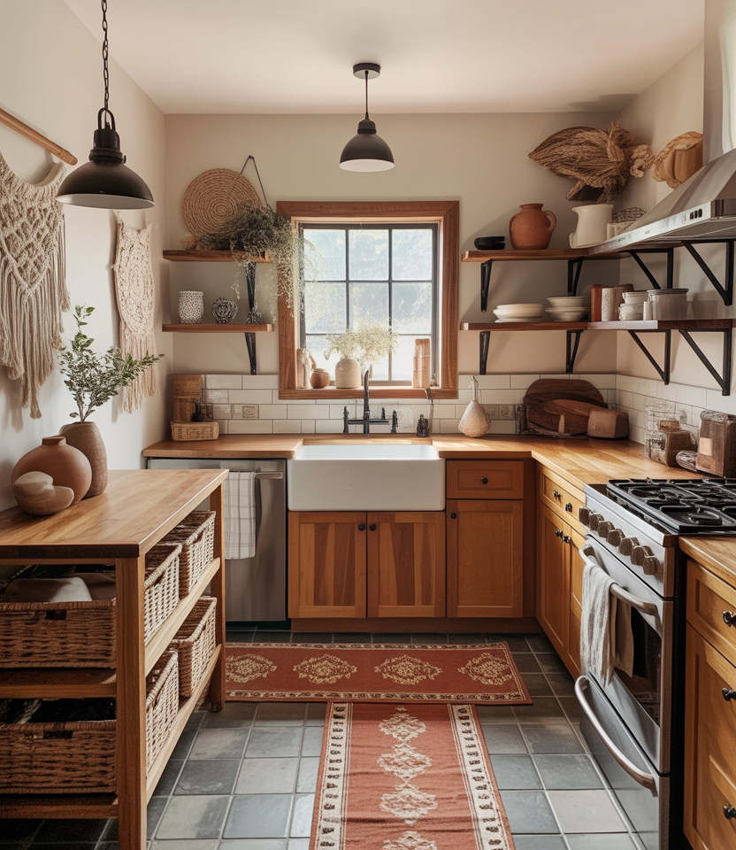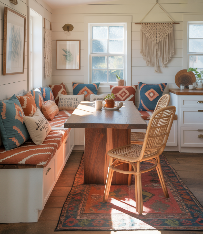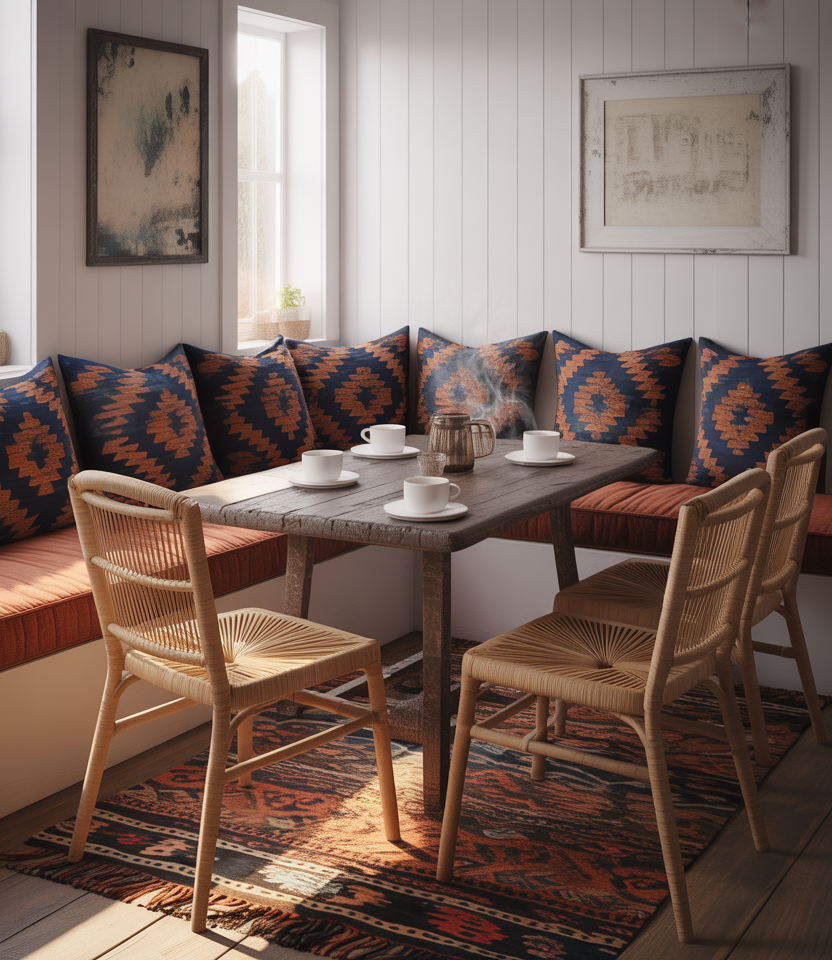 A boho-style farmhouse nook for breakfast adds pattern and play to the kitchen without overwhelming it. In 2026, you’ll see built-in benches layered with kilim cushions, rattan chairs, and collected art leaning casually on a ledge. It’s an effortless add-on for coastal or urban homes where morning coffee needs a soft landing spot. Mix blue and terracotta textiles, woven shades, and a small vintage rug to define the area. The rest of the kitchen can stay fairly simple; the nook acts as the personality zone where kids do homework, friends linger over brunch, and you flip through cookbooks on quiet evenings.