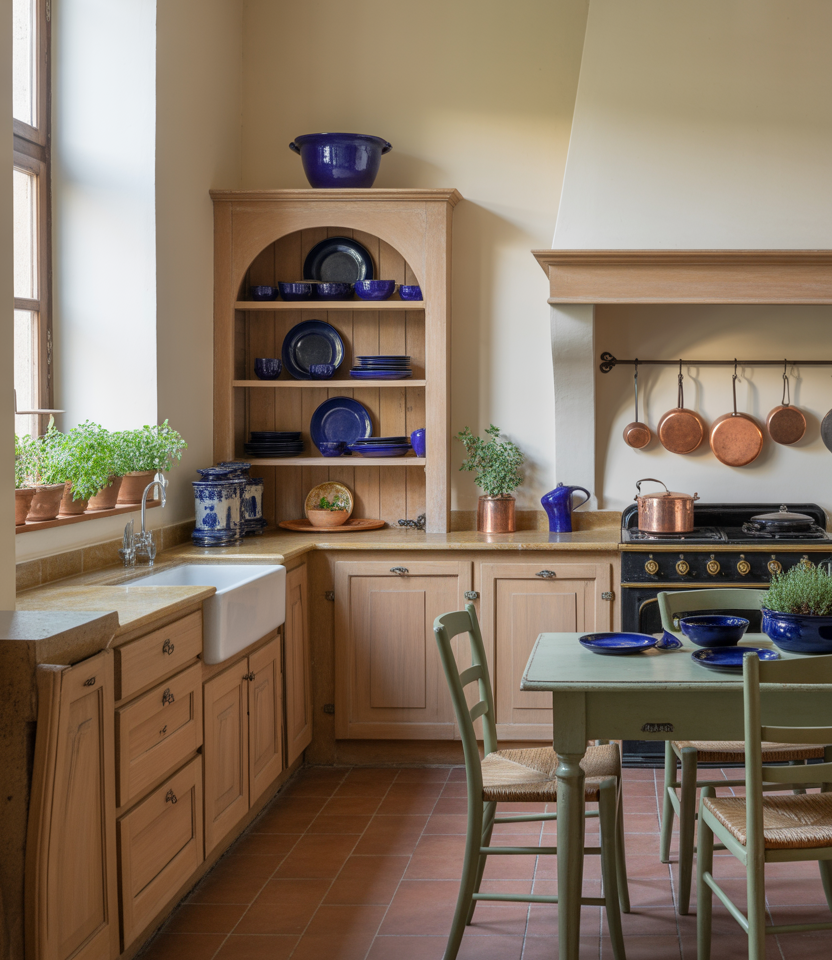A 2026 farmhouse kitchen with a broad European mix borrows from Nordic calm, Tuscan warmth, and English practicality. Layer pale woods, stone, and linen with blue pottery and soft green tones to keep things cozy and personal. Add copper pots, unfitted furniture, and a free-standing larder so the room feels collected over time, not installed in one weekend. This idea works in both new builds and remodels, letting you blend travel memories into everyday cooking and casual entertaining with friends. Even a plain suburban box gains character when you mix worn pieces with streamlined appliances.