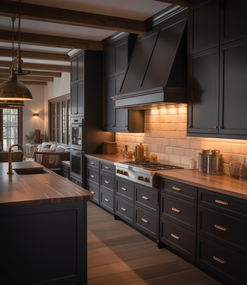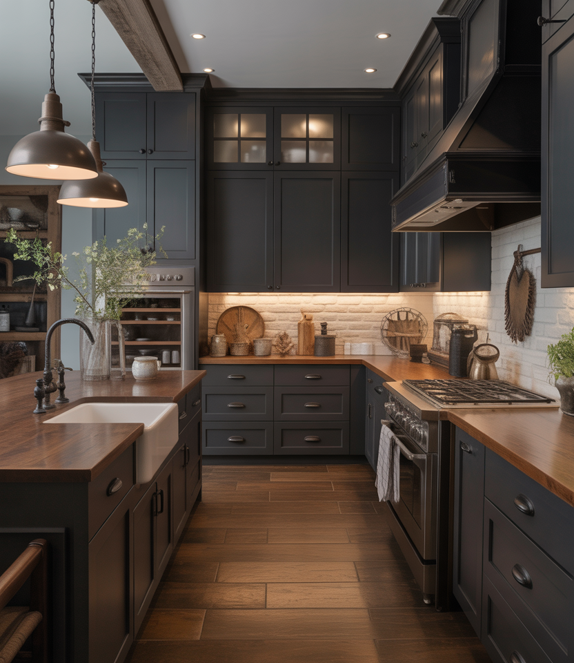 For anyone tired of all-white kitchens, a moody, dark farmhouse scheme feels fresh for 2026. Deep charcoal cabinets, black hardware, and walnut counters create intimacy, especially when paired with soft sconces and warm metals. The trick, as bloggers on large design sites often note, is adding contrast: pale stone, cream textiles, or a light ceiling so the room doesn’t feel like a cave. This idea shines in open-concept homes where you want the kitchen to feel like a sophisticated bar at night but still be welcoming for Sunday pancakes.