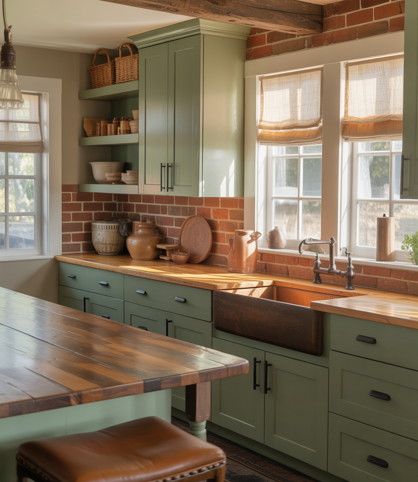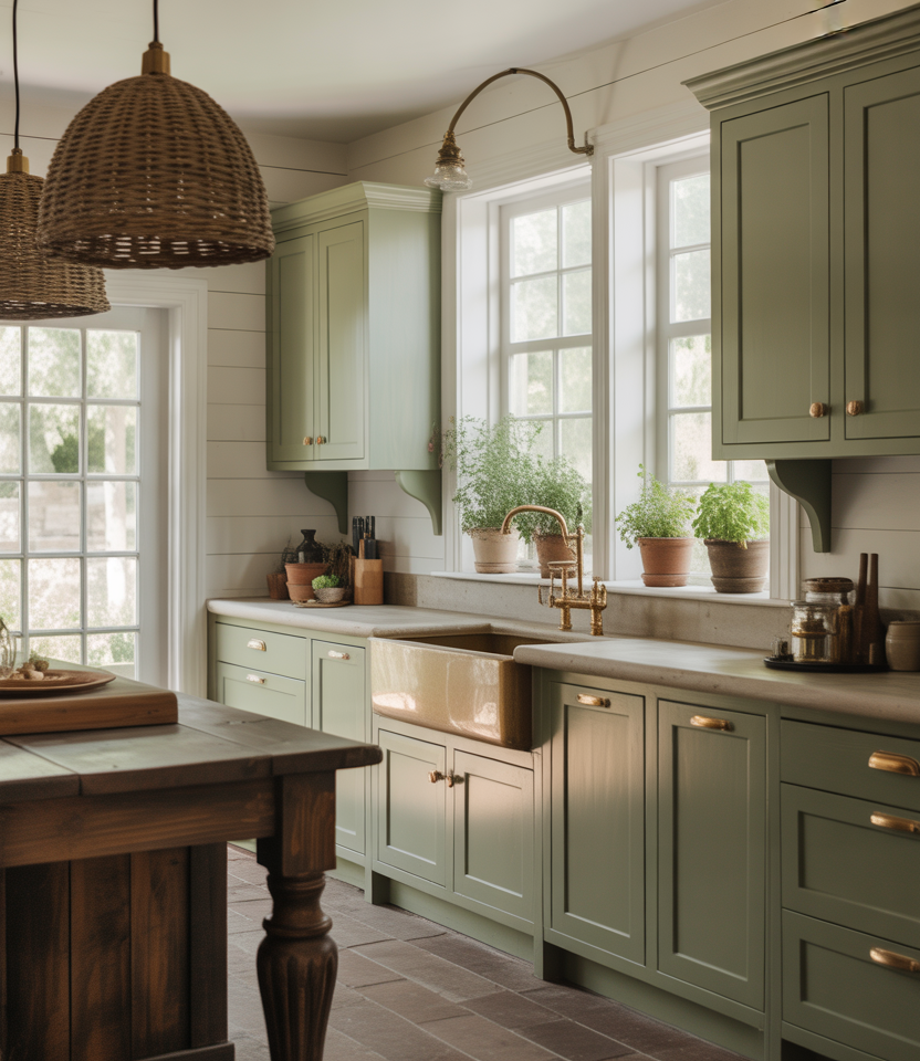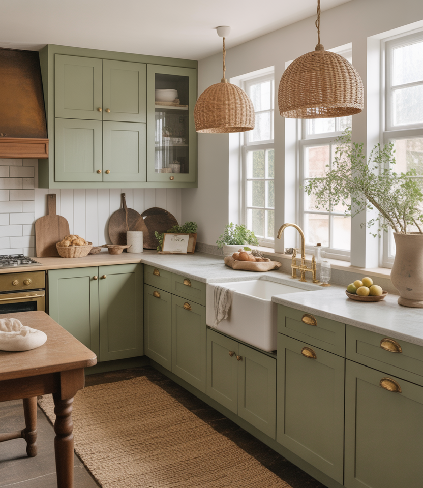 A sage green farmhouse kitchen is the quieter cousin of bold color trends, and it’s everywhere in 2026 inspiration boards. This muted green works beautifully with white walls, woven pendants, and stone counters, creating a soft country calm that never feels dated. It’s ideal for people who cook a lot and want visual rest, not high-contrast drama. Brushed brass, cream ceramics, and simple Shaker fronts keep the look grounded. Whether in a starter home or a forever house, the palette helps blur seasons and trends, feeling gentle on bright summer mornings and snowy afternoons alike.