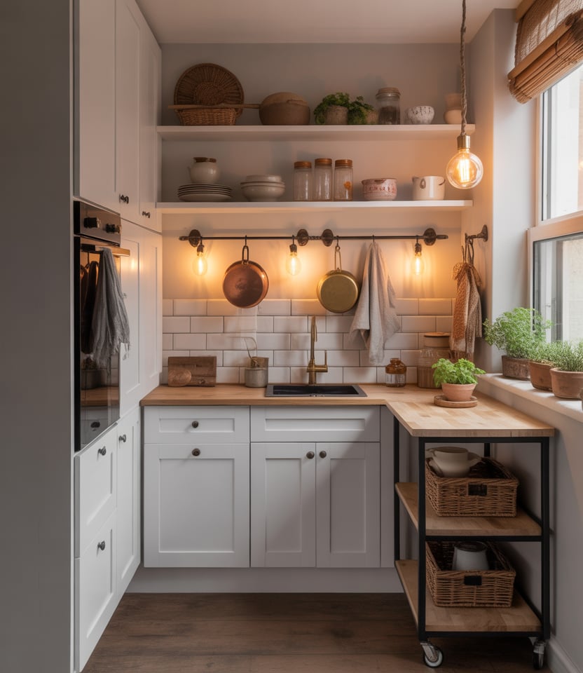 A tiny farmhouse kitchen in 2026 proves you don’t need sprawling square footage to create charm. Smart Modern storage options, such as toe-kick drawers and ceiling-height cabinets, combine with rustic stools or vintage hooks to create a soulful atmosphere in the space. Narrow galley layouts become cozy work zones when you add warm lighting, slim islands on casters, and open shelves for everyday dishes. This idea is perfect for apartments and small cottages where every inch matters. The goal isn’t to hide everything but to curate only what you truly use, turning limited space into a snug, efficient heart of the home.